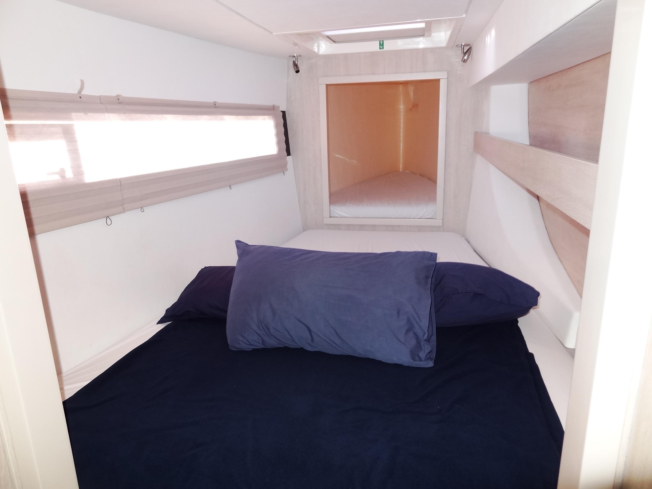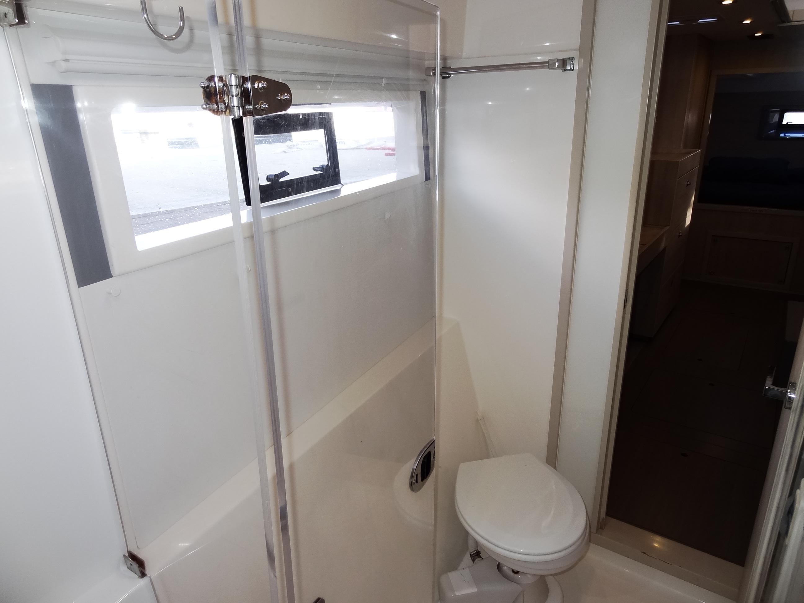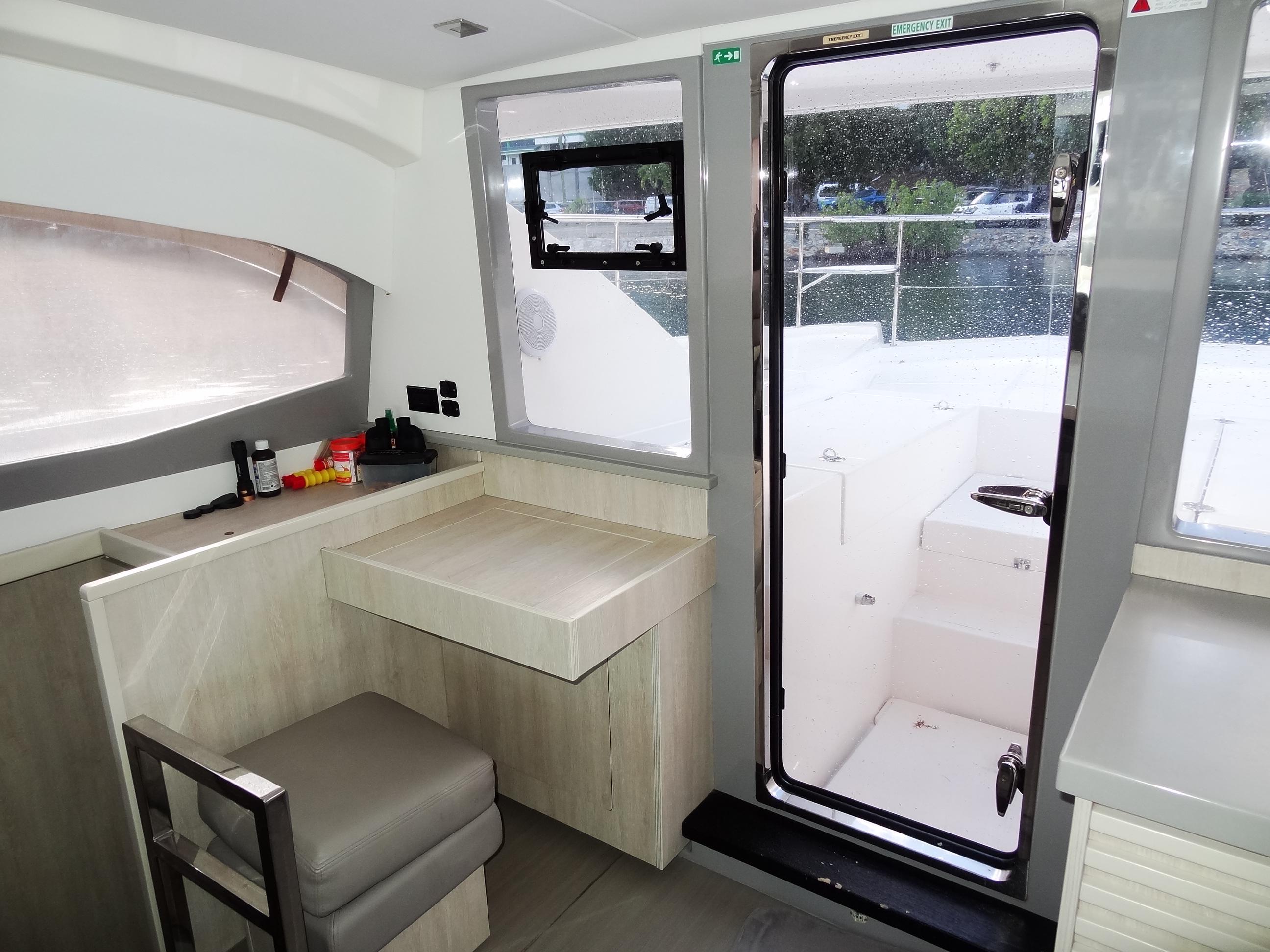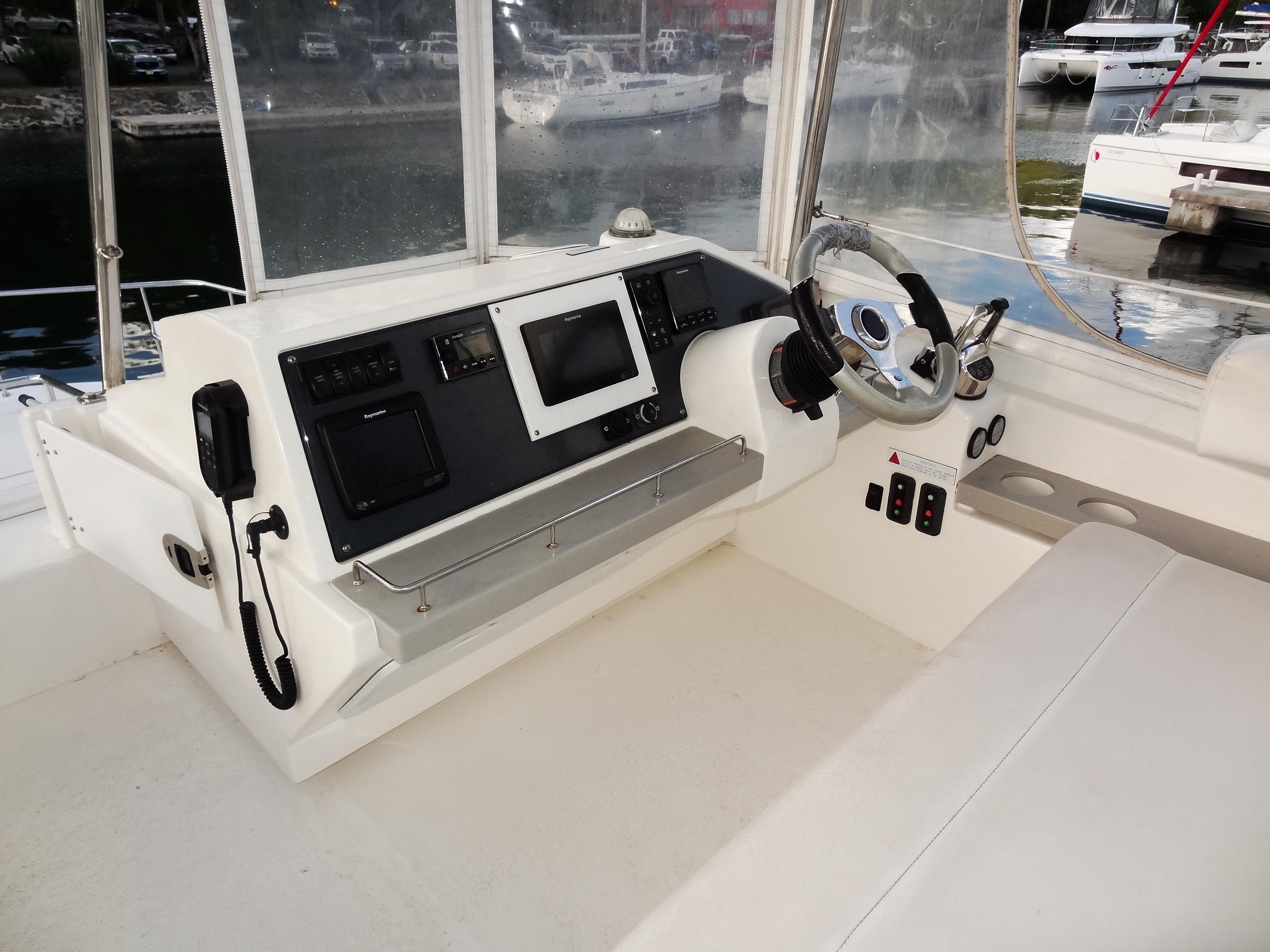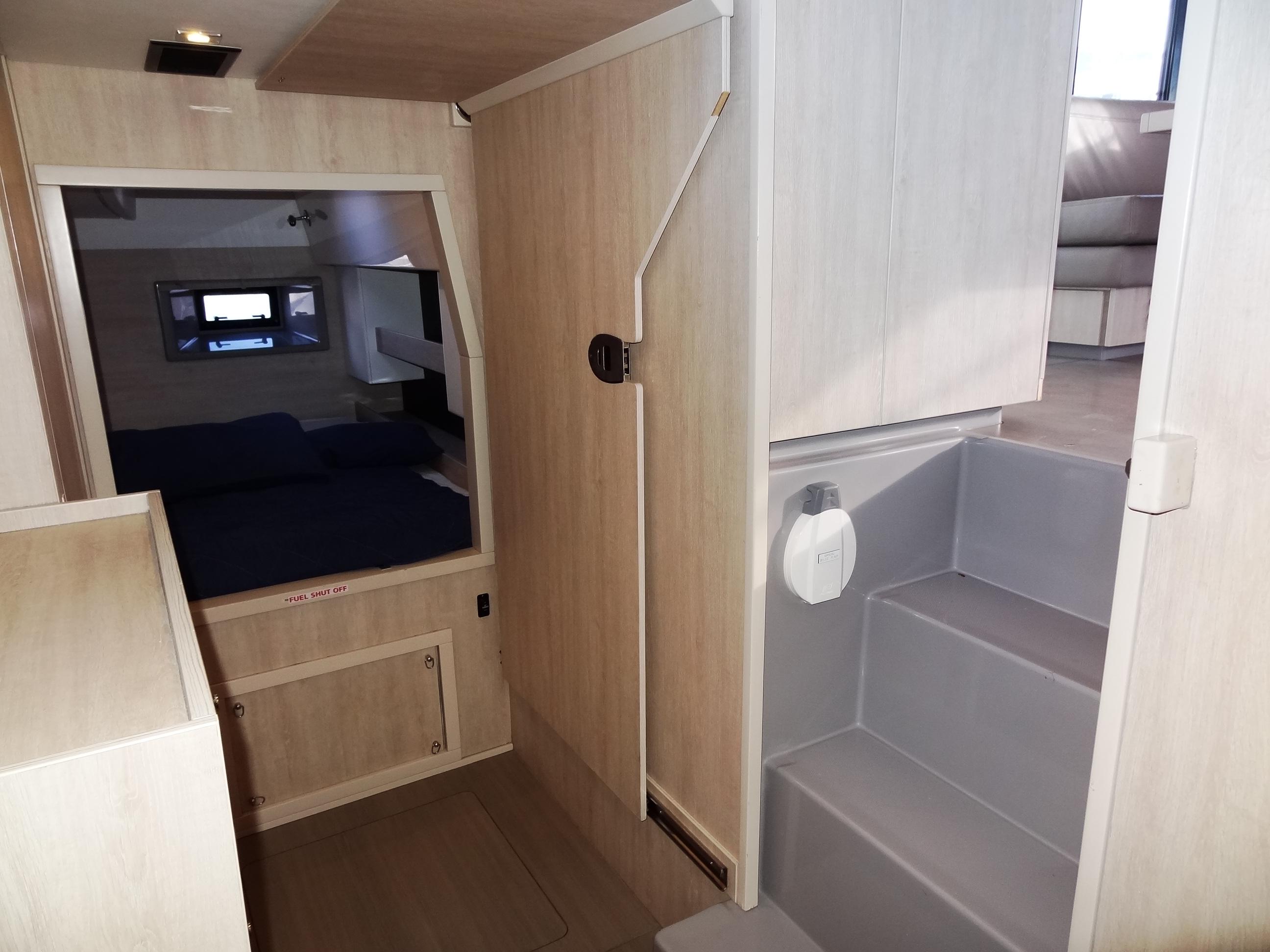 The narrower hulls and less wetted surface area below the waterline allow the boat to reach an impressive maximum speed of 23+ knots (27 MPH) and maintaining exceptional fuel efficiency consistent with the brand. Her large fly-bridge offers 360 degree views making navigation easy and safe. The new interior layout with the galley located forward and the forward facing table and settee are now located aft. The starboard hull is entirely dedicated to the Owner’s suite with spacious master cabin with private head with large separate shower compartment in the forward section of the hull. The light blond interior shows well through out the boat including guest cabins adding to the feeling of ample space.