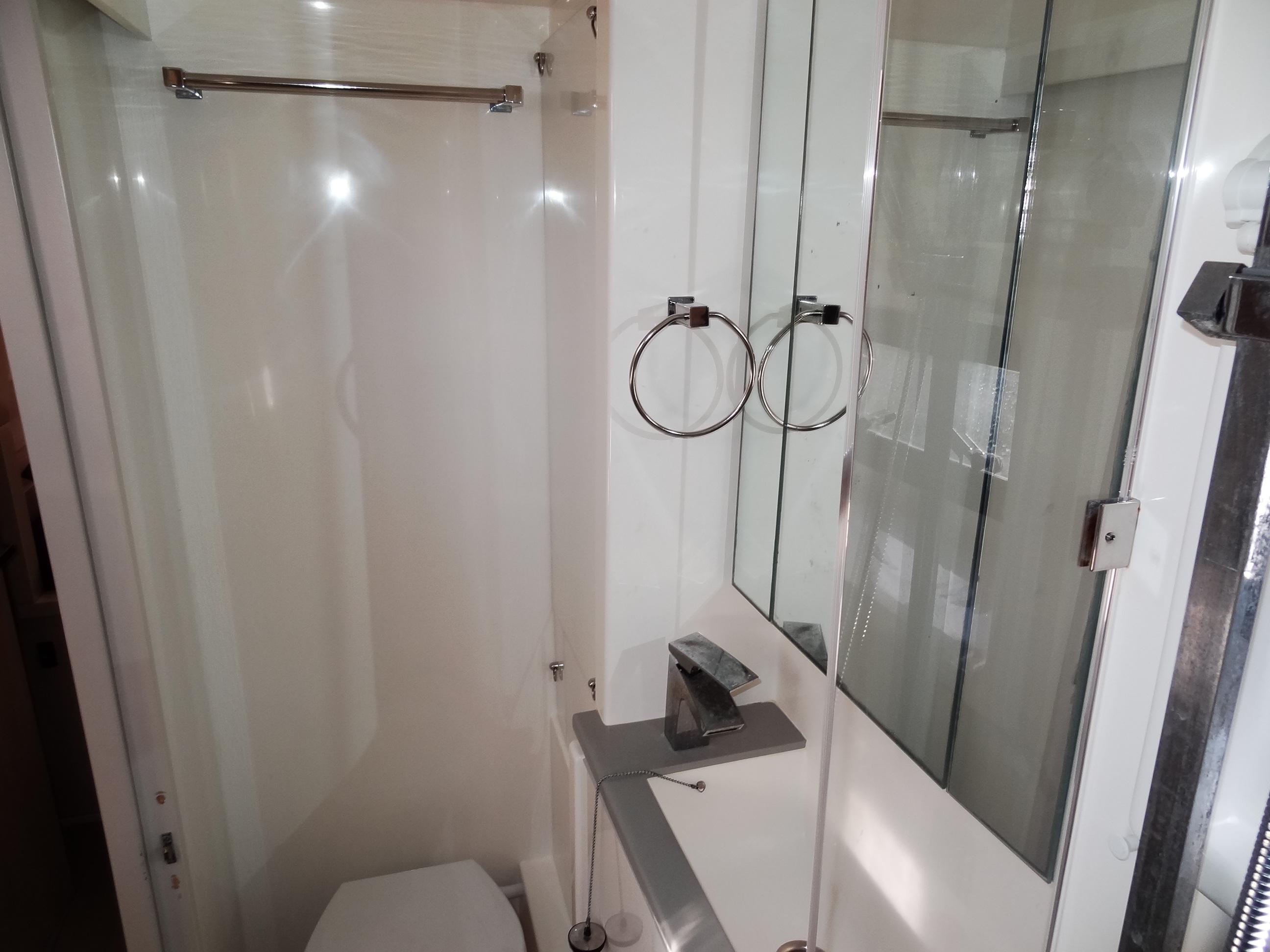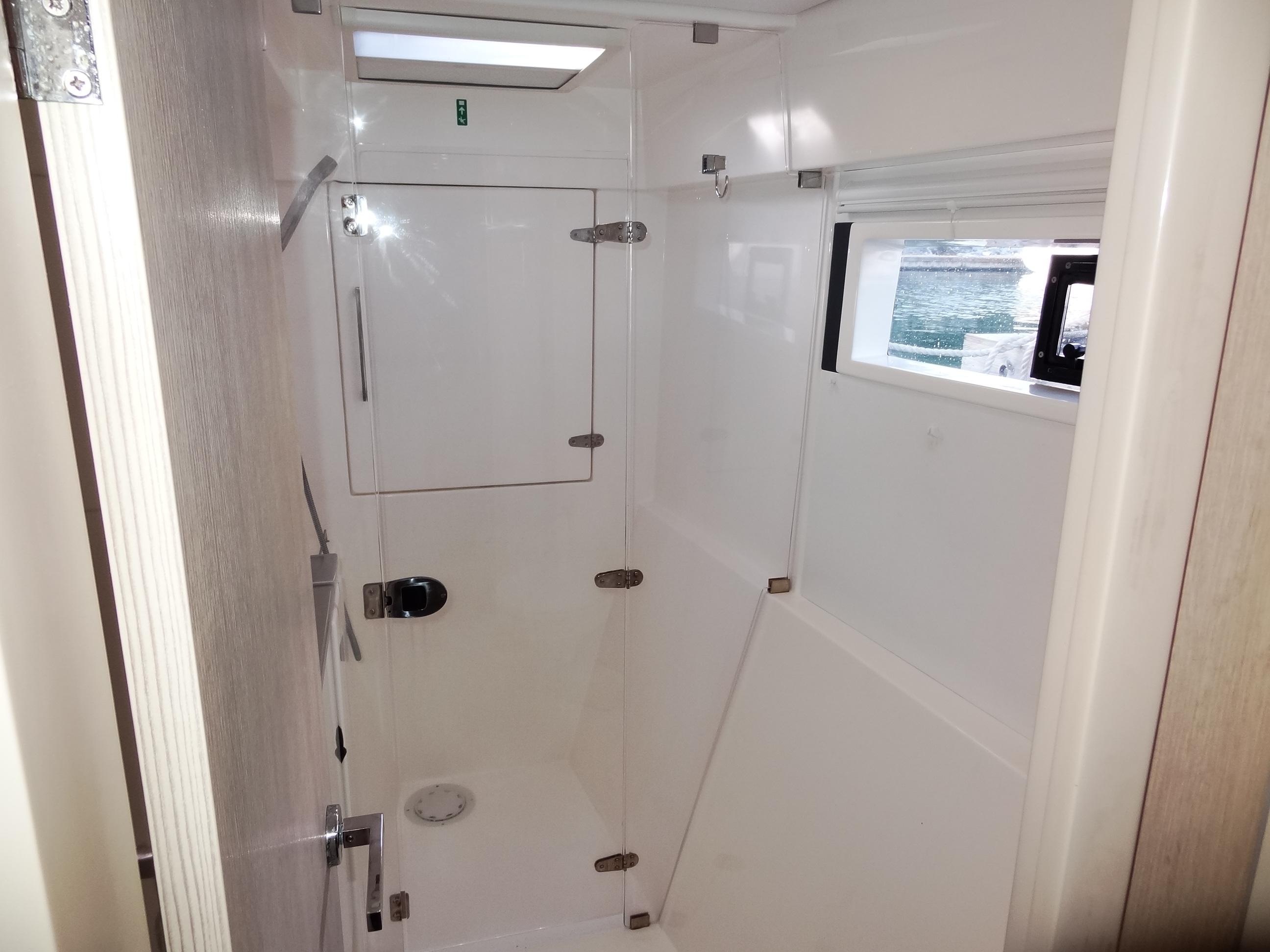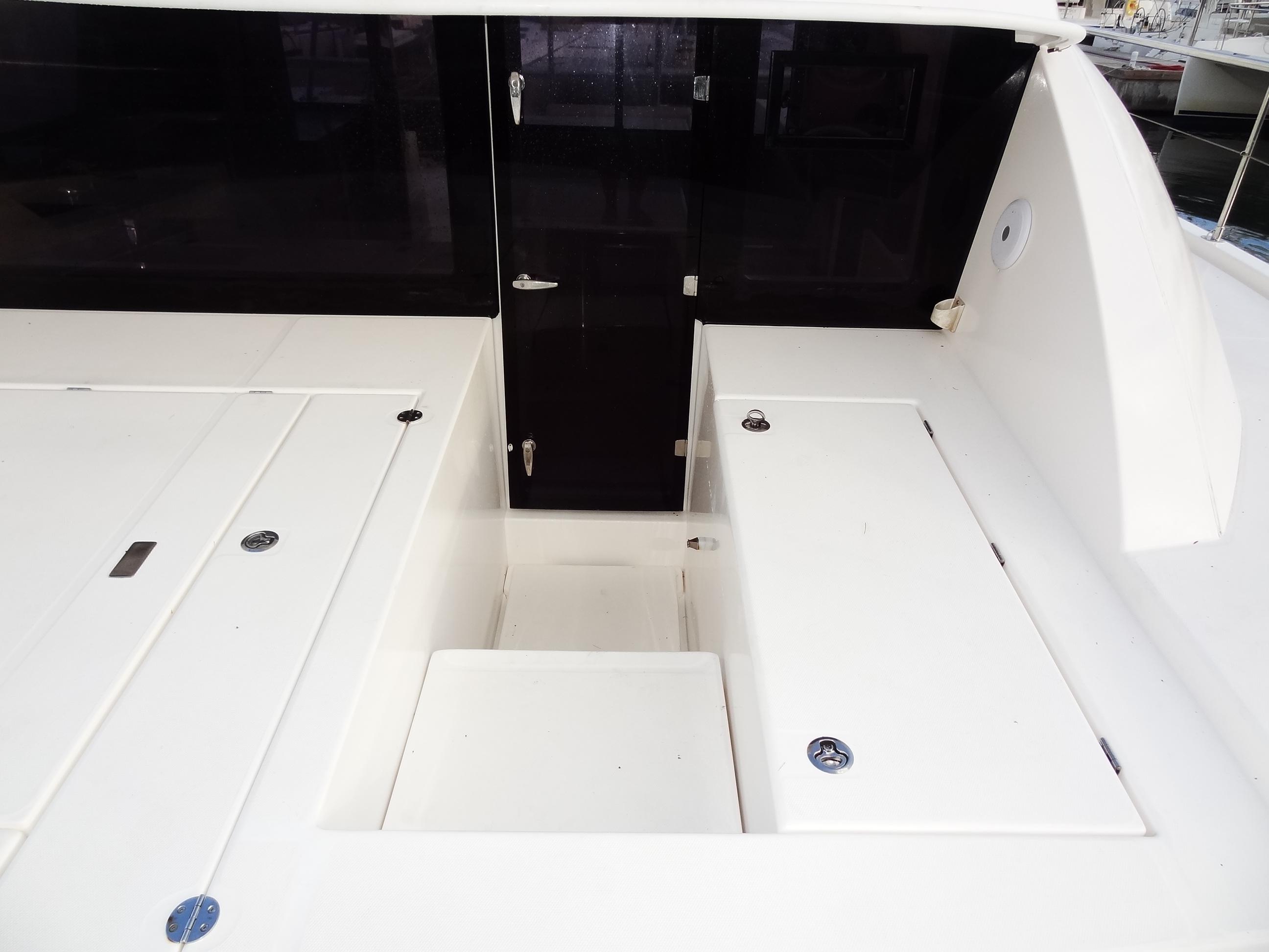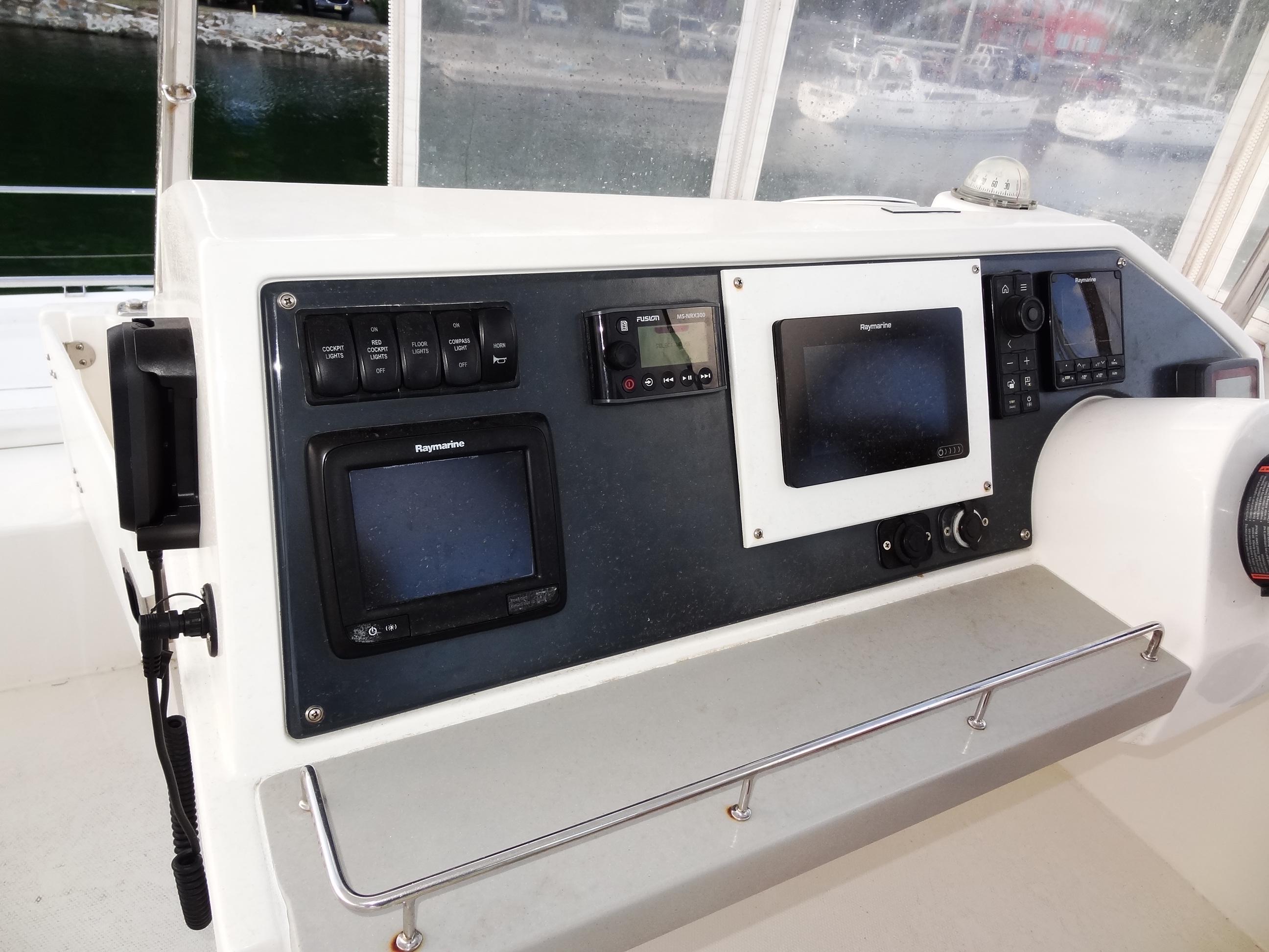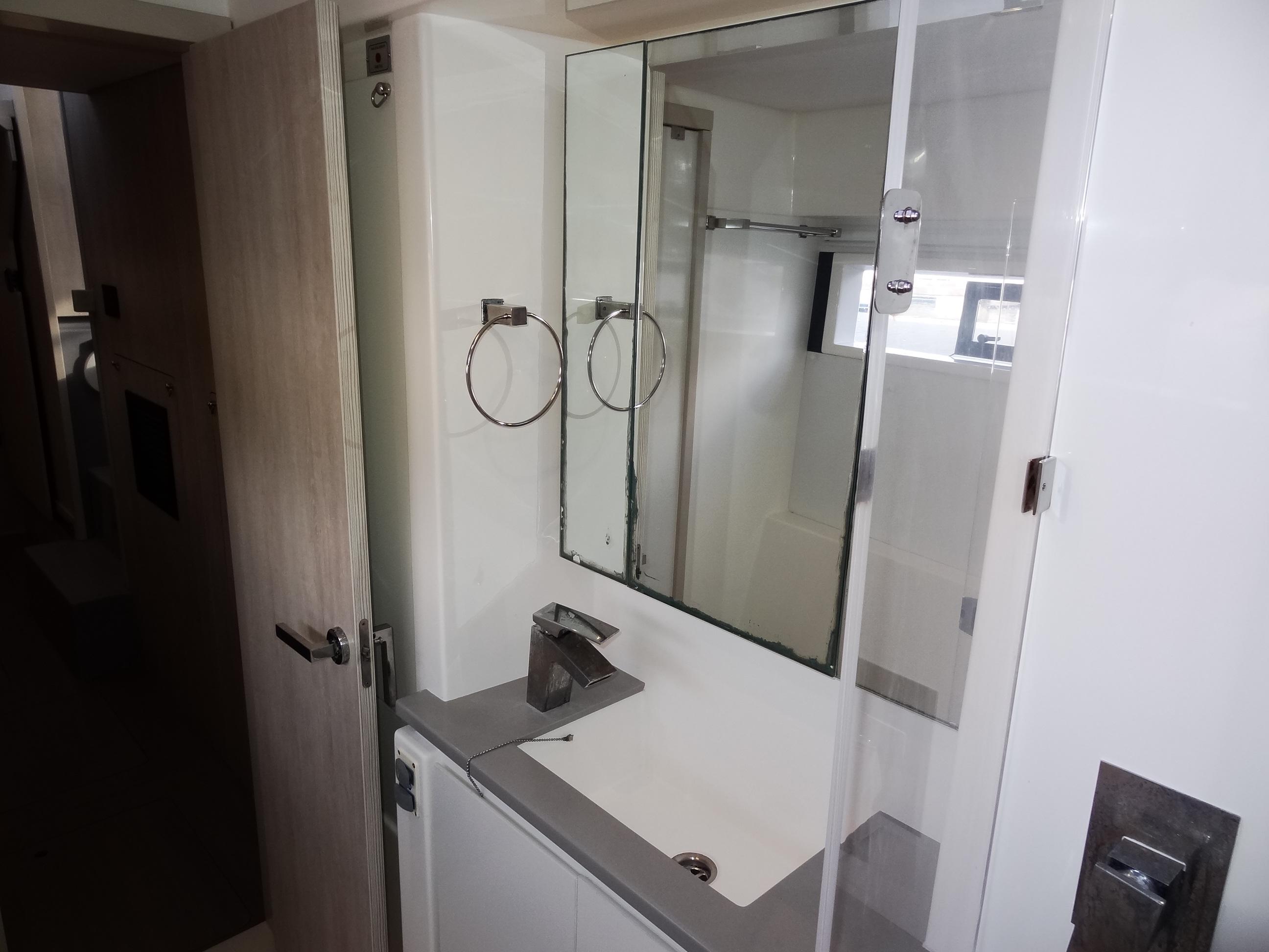 The narrower hulls and less wetted surface area below the waterline allow the boat to reach an impressive maximum speed of 23+ knots (27 MPH) and maintaining exceptional fuel efficiency consistent with the brand. Her large fly-bridge offers 360 degree views making navigation easy and safe. The new interior layout with the galley located forward and the forward facing table and settee are now located aft. The starboard hull is entirely dedicated to the Owner’s suite with spacious master cabin with private head with large separate shower compartment in the forward section of the hull. The light blond interior shows well through out the boat including guest cabins adding to the feeling of ample space.