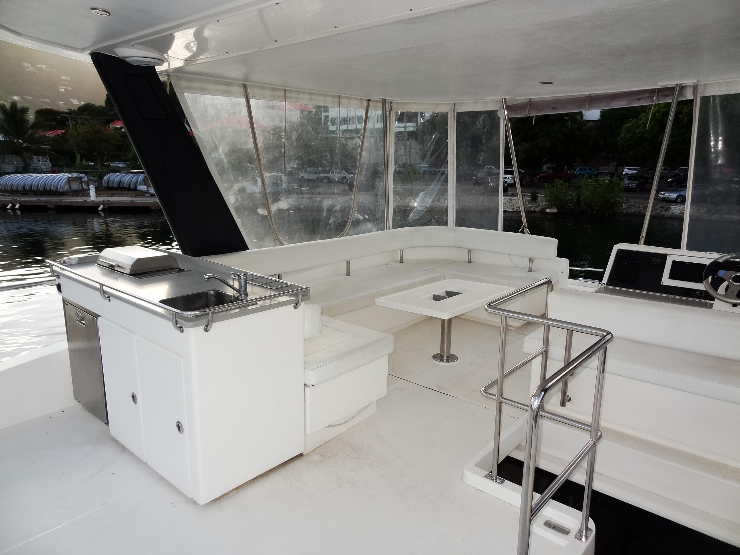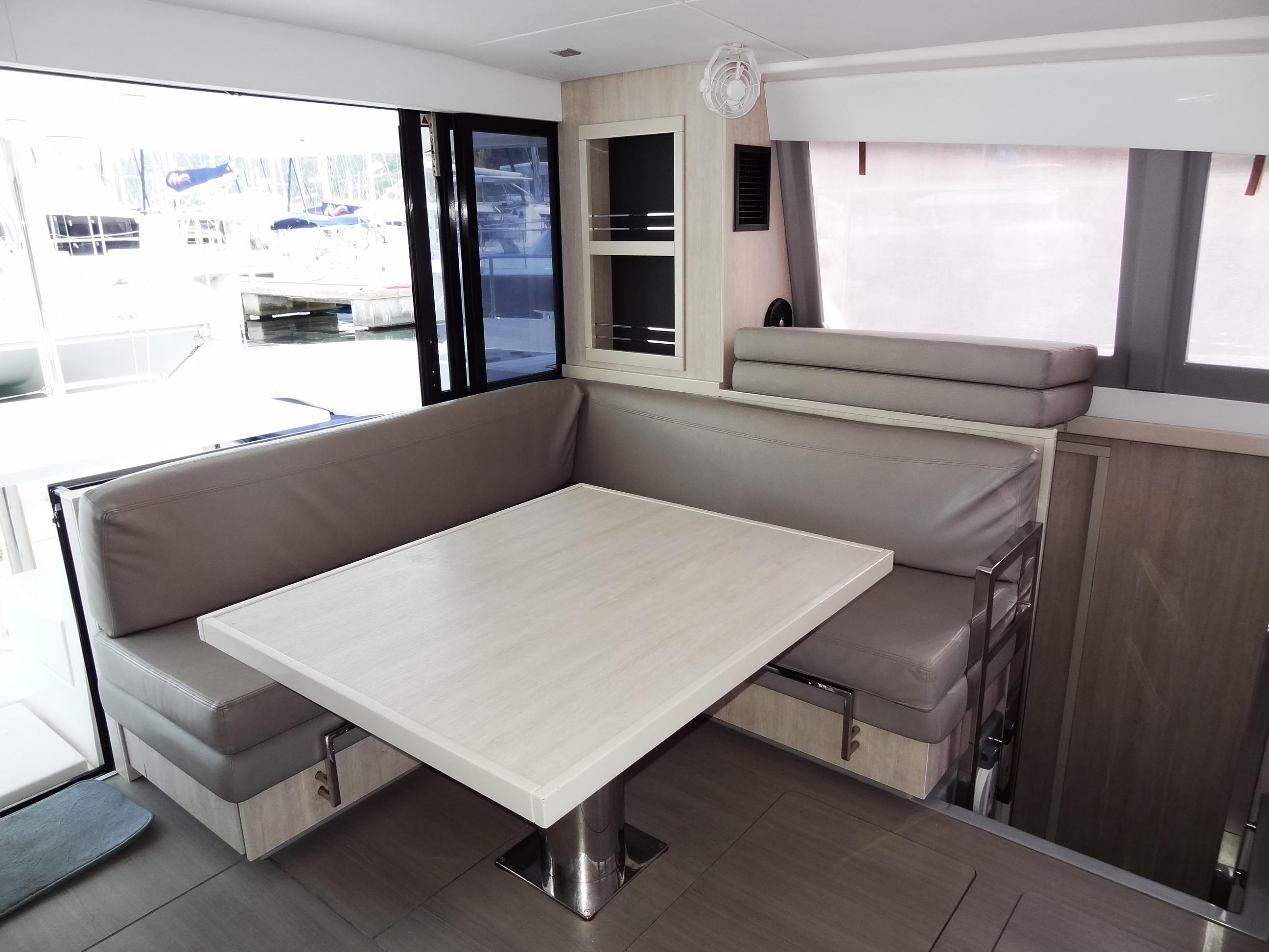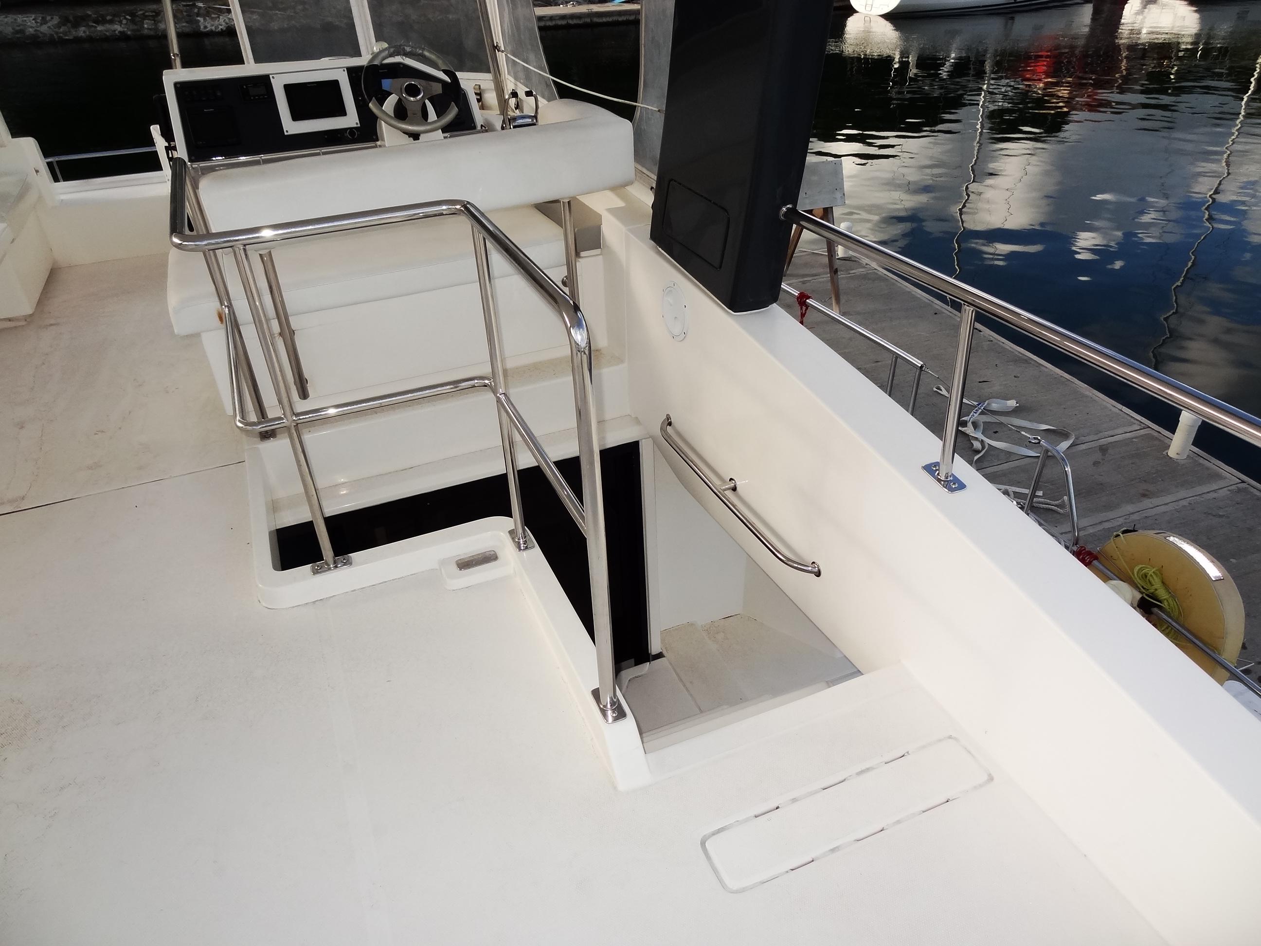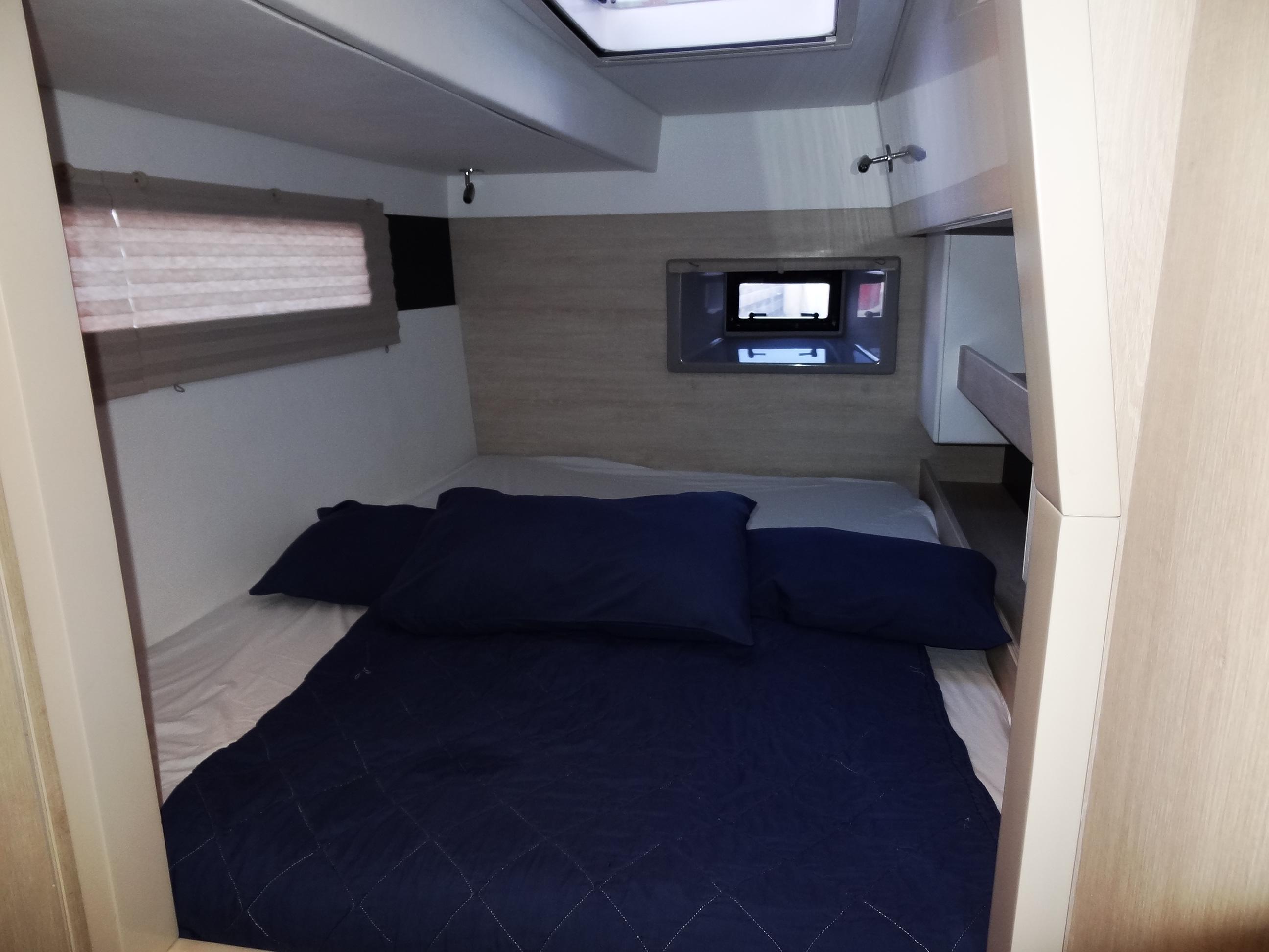 The narrower hulls and less wetted surface area below the waterline allow the boat to reach an impressive maximum speed of 23+ knots (27 MPH) and maintaining exceptional fuel efficiency consistent with the brand. Her large fly-bridge offers 360 degree views making navigation easy and safe. The new interior layout with the galley located forward and the forward facing table and settee are now located aft. The starboard hull is entirely dedicated to the Owner’s suite with spacious master cabin with private head with large separate shower compartment in the forward section of the hull. The light blond interior shows well through out the boat including guest cabins adding to the feeling of ample space.