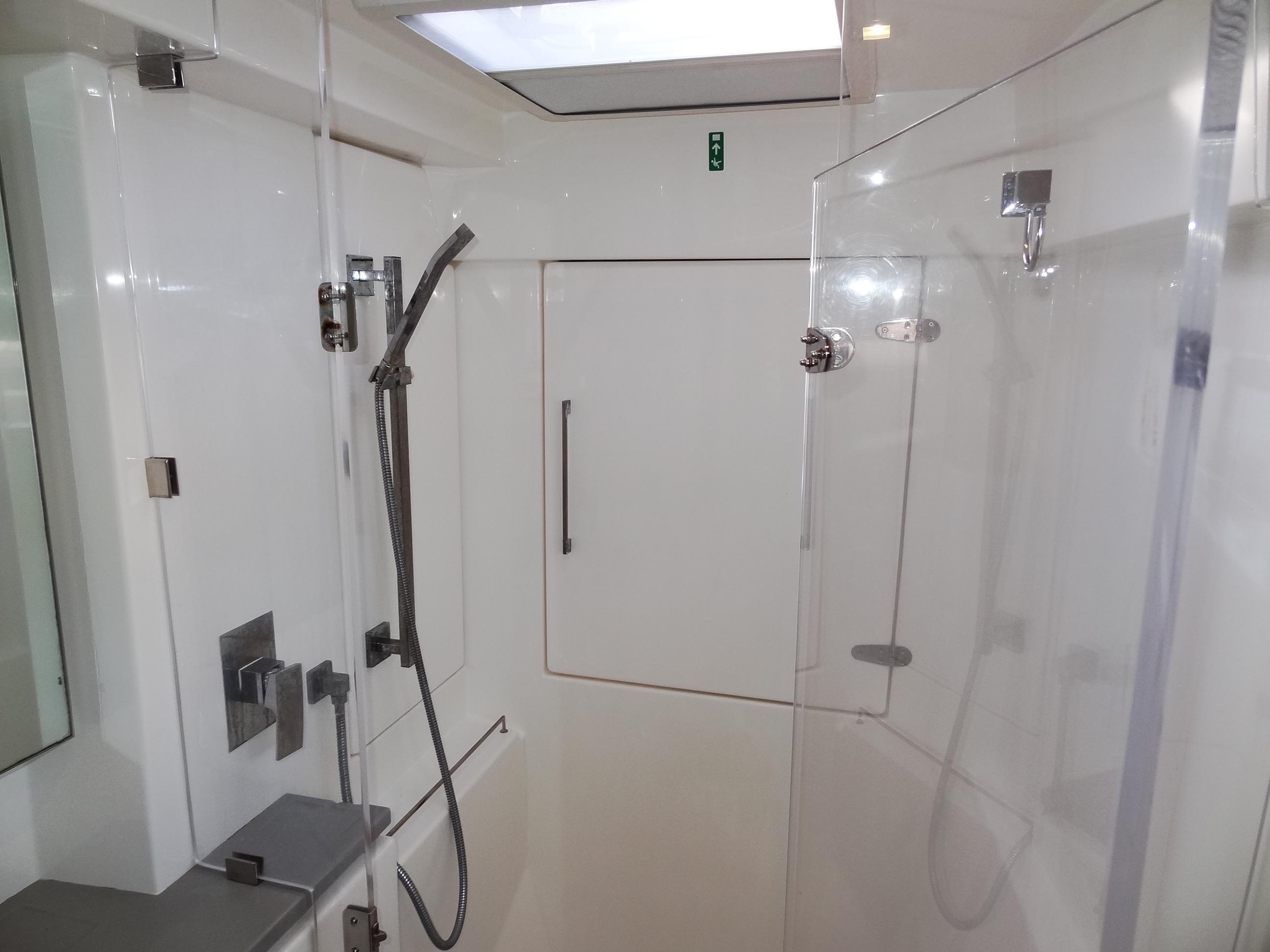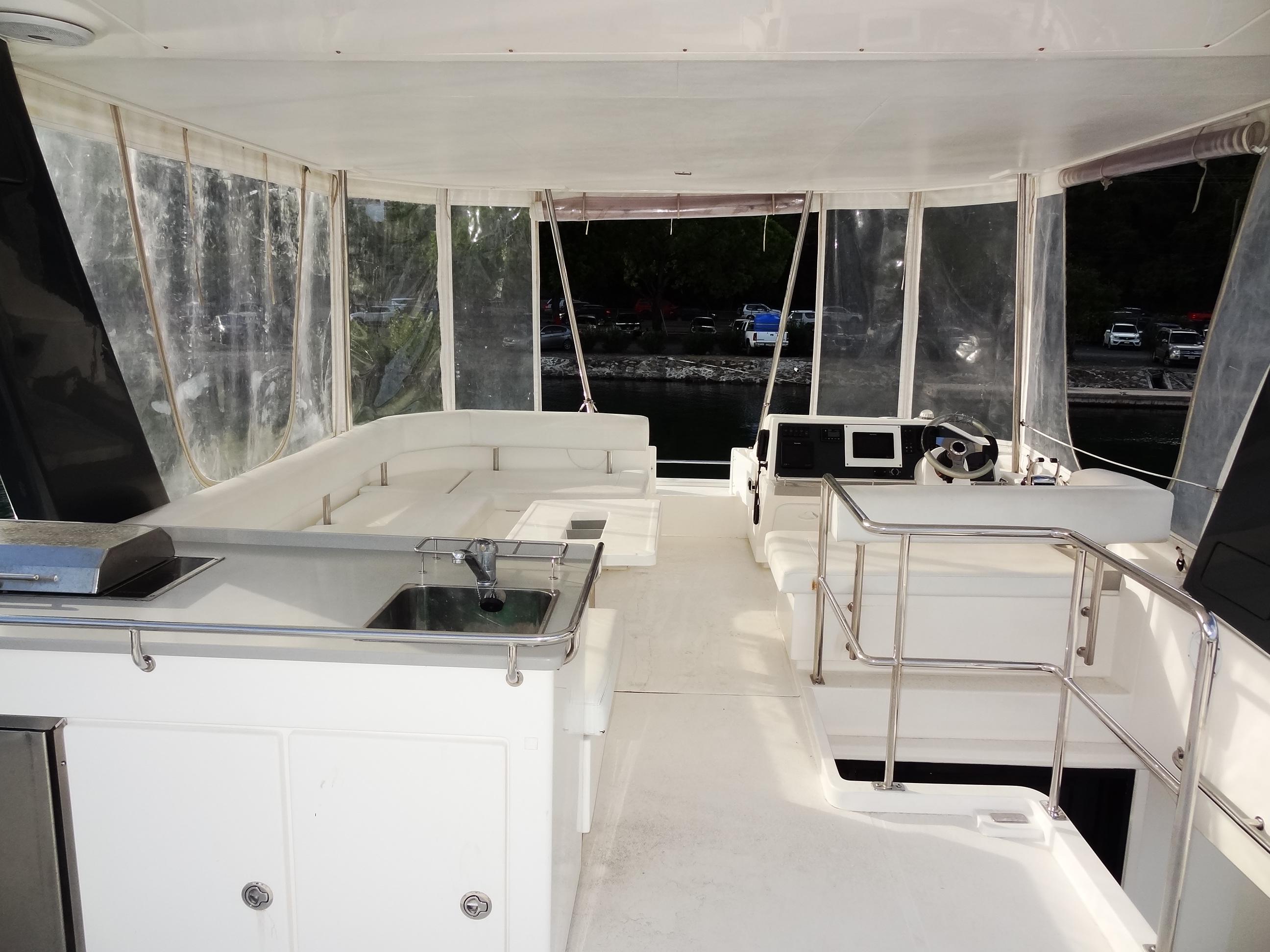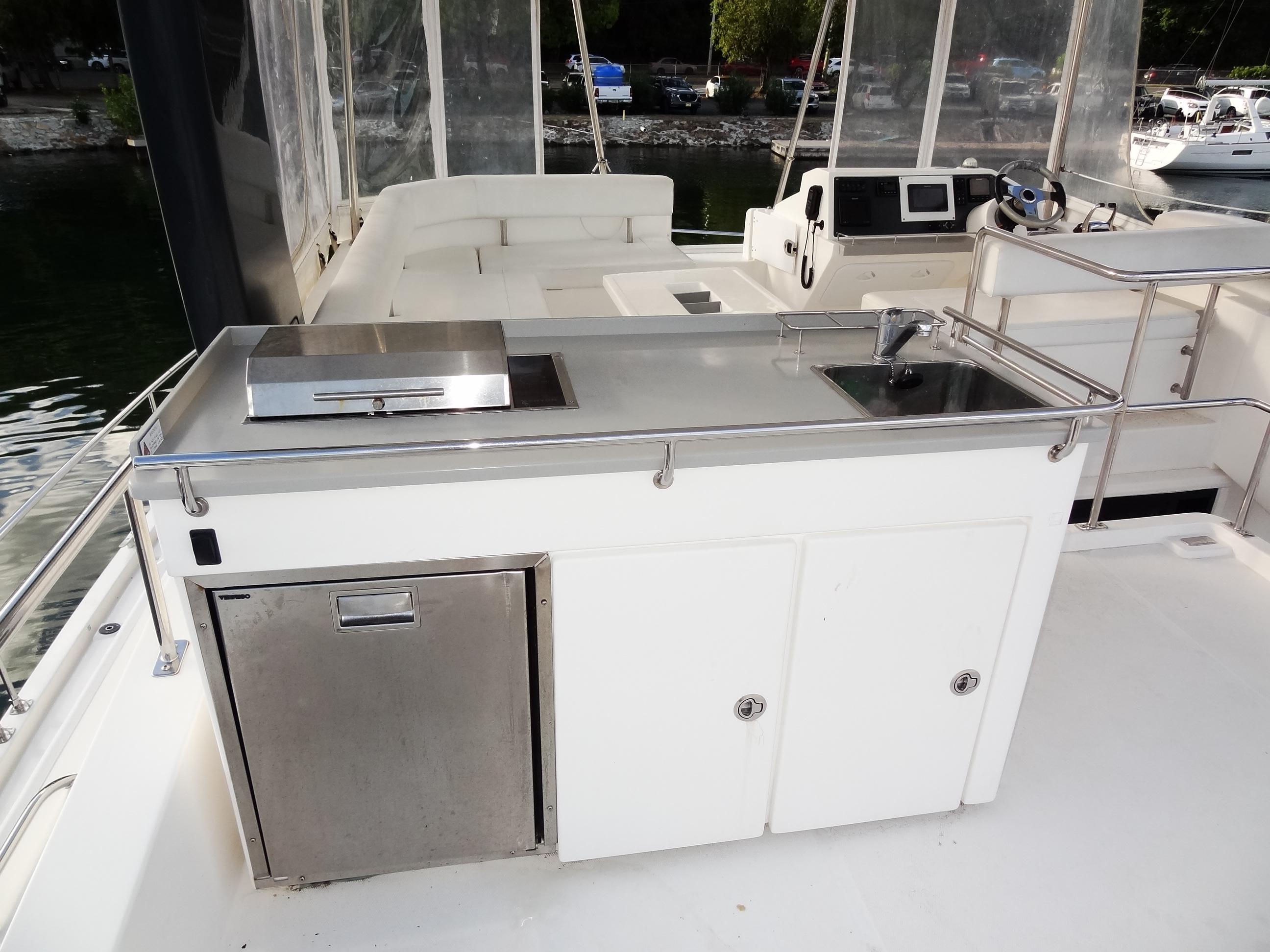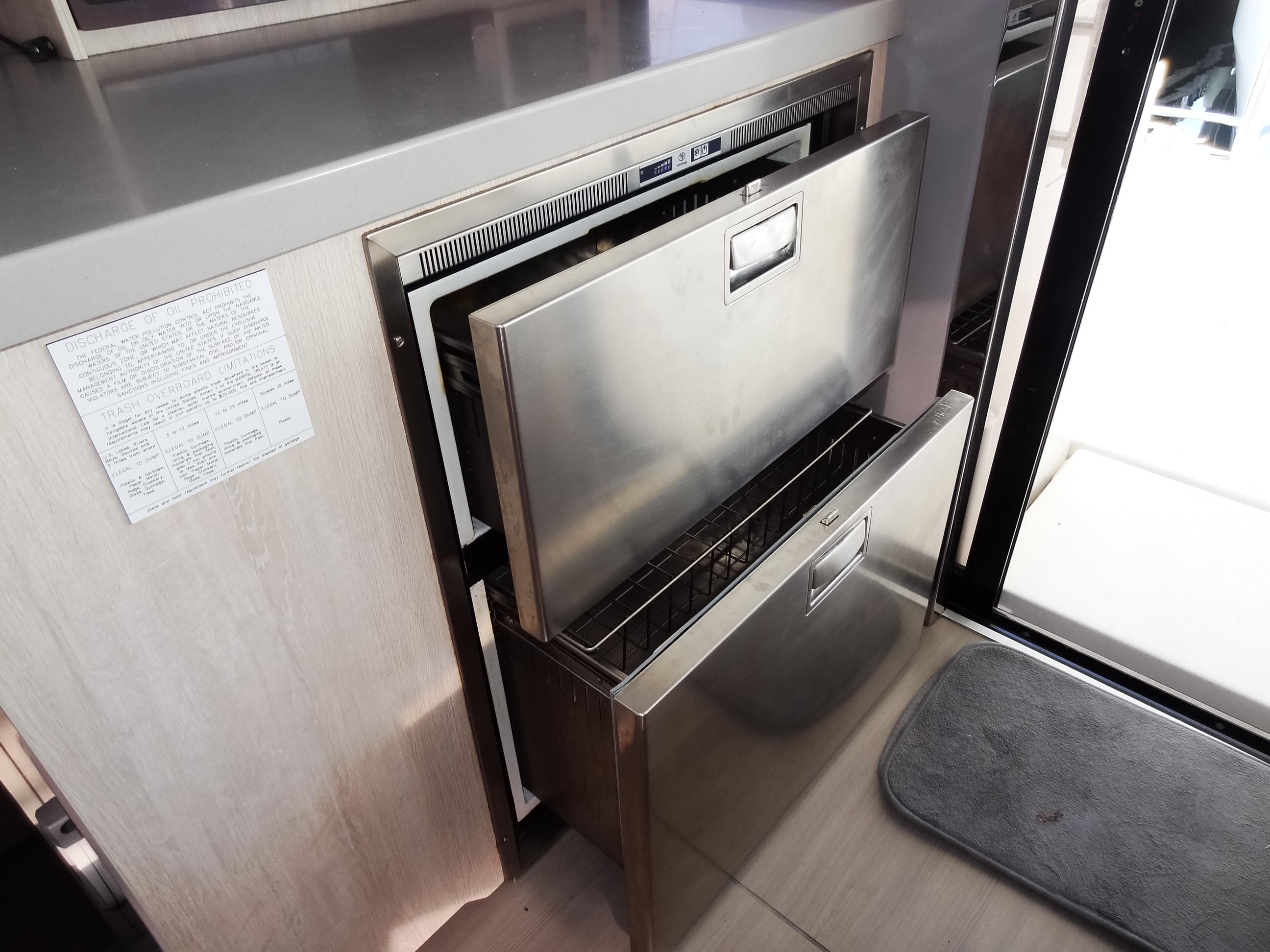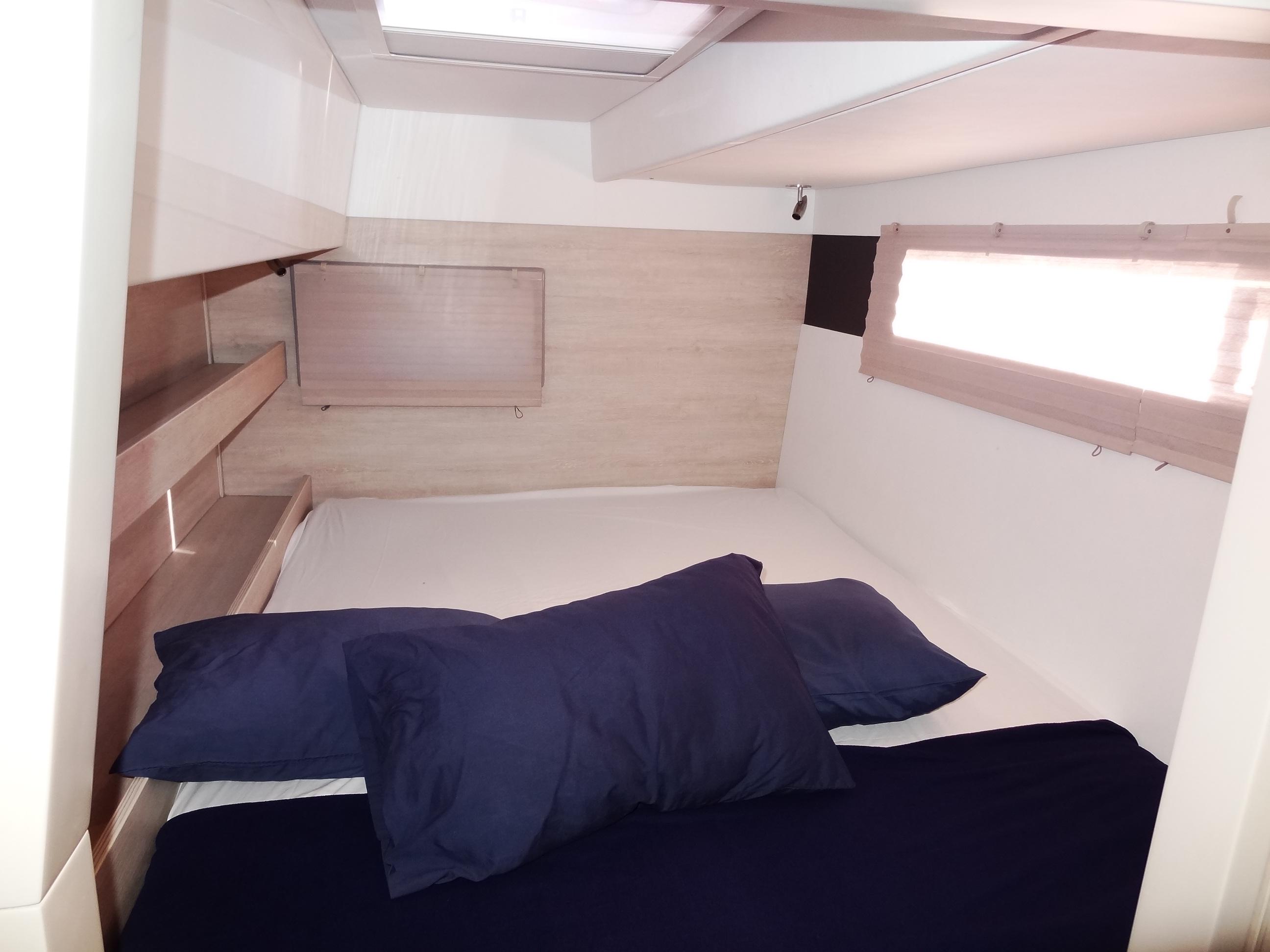 The narrower hulls and less wetted surface area below the waterline allow the boat to reach an impressive maximum speed of 23+ knots (27 MPH) and maintaining exceptional fuel efficiency consistent with the brand. Her large fly-bridge offers 360 degree views making navigation easy and safe. The new interior layout with the galley located forward and the forward facing table and settee are now located aft. The starboard hull is entirely dedicated to the Owner’s suite with spacious master cabin with private head with large separate shower compartment in the forward section of the hull. The light blond interior shows well through out the boat including guest cabins adding to the feeling of ample space.