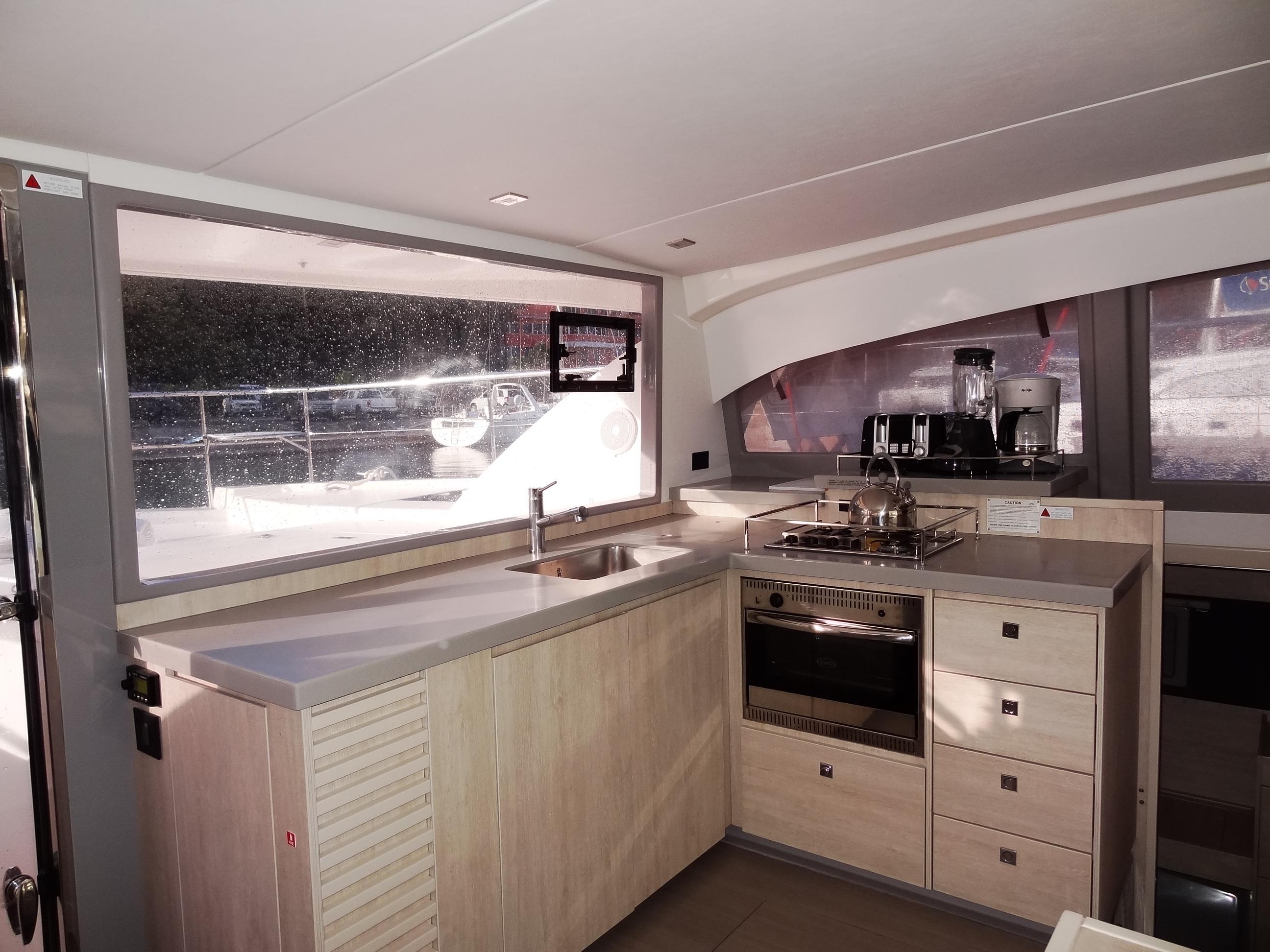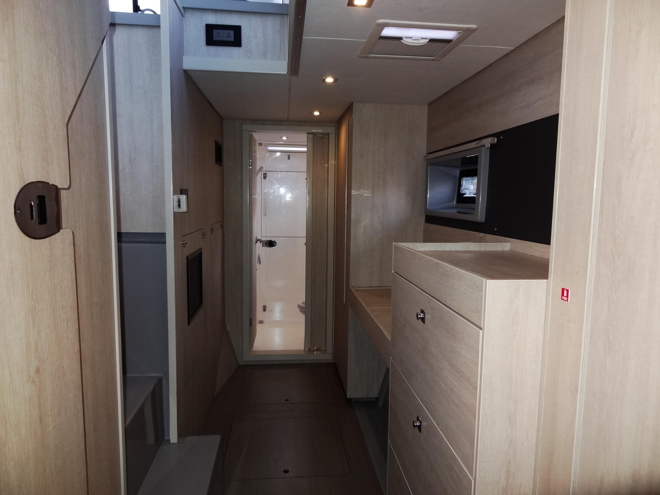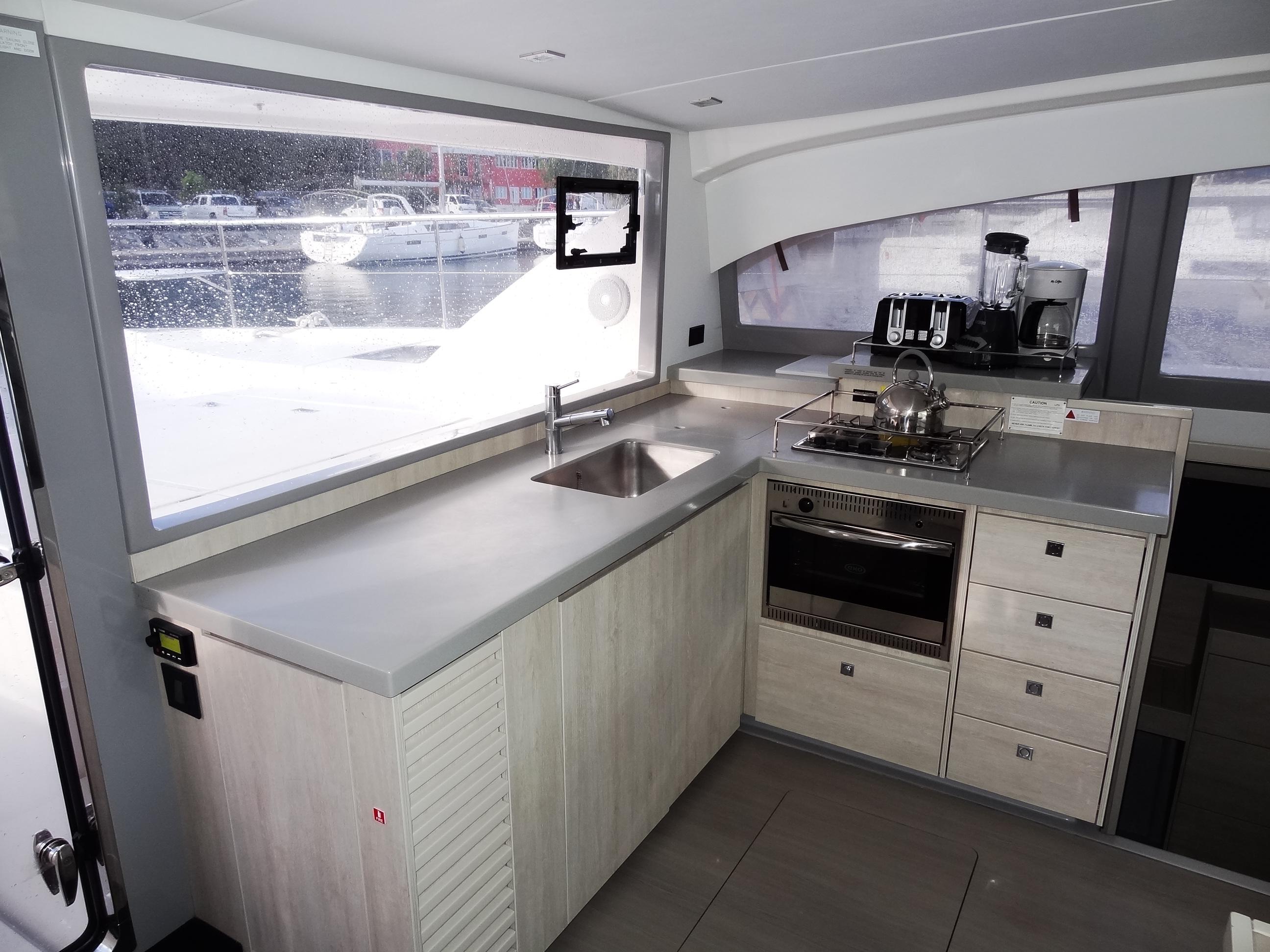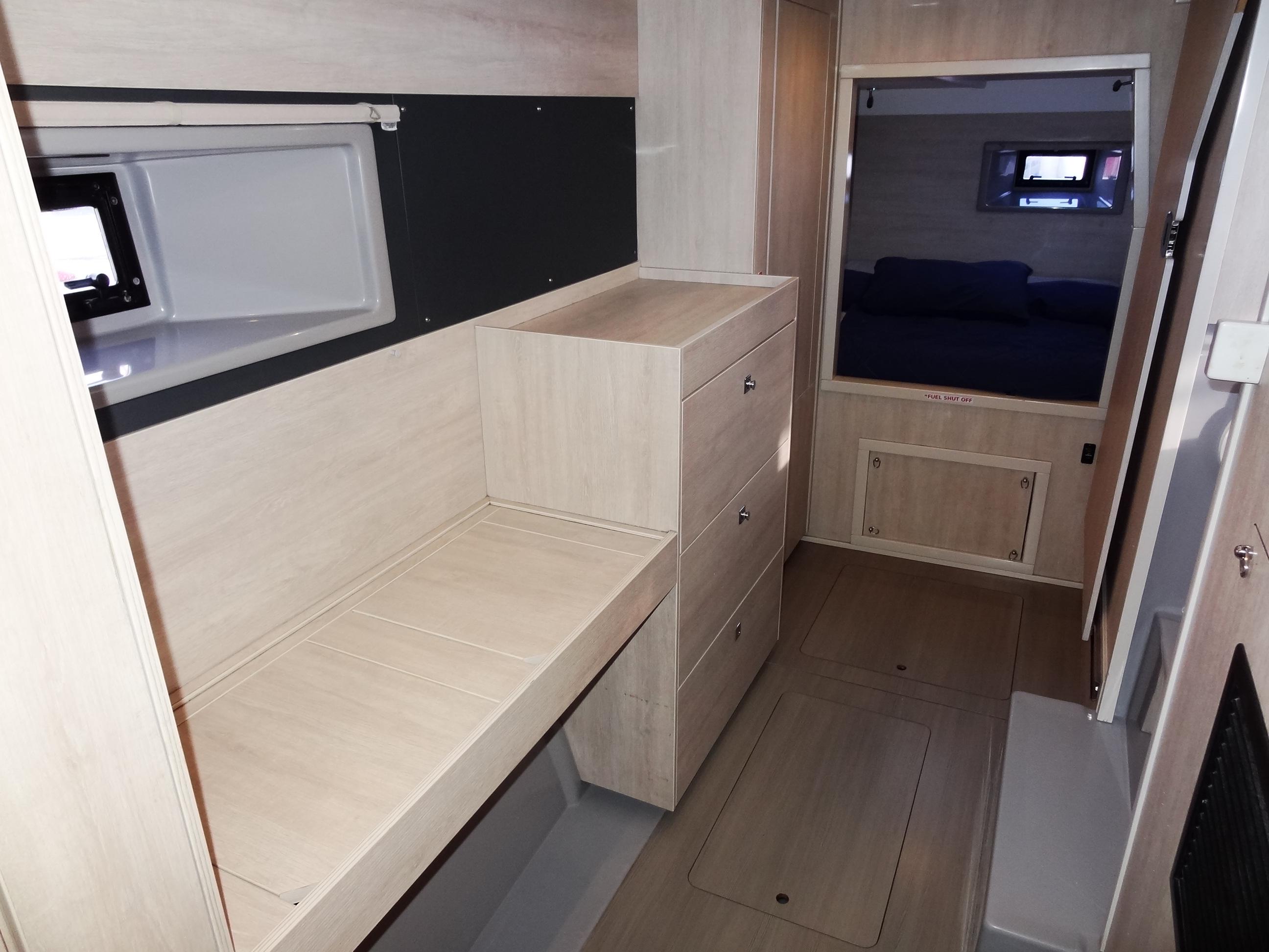 Her increased interior-exterior living space promotes a convivial atmosphere and her functional design makes her exceedingly user friendly. Whether crossing oceans, at anchor or on the deck this boat will not disappoint. The stepped hull design offers 27% more interior volume than her predecessor above the waterline, allowing for a roomy accommodation in the hulls without sacrificing on performance of the yacht.