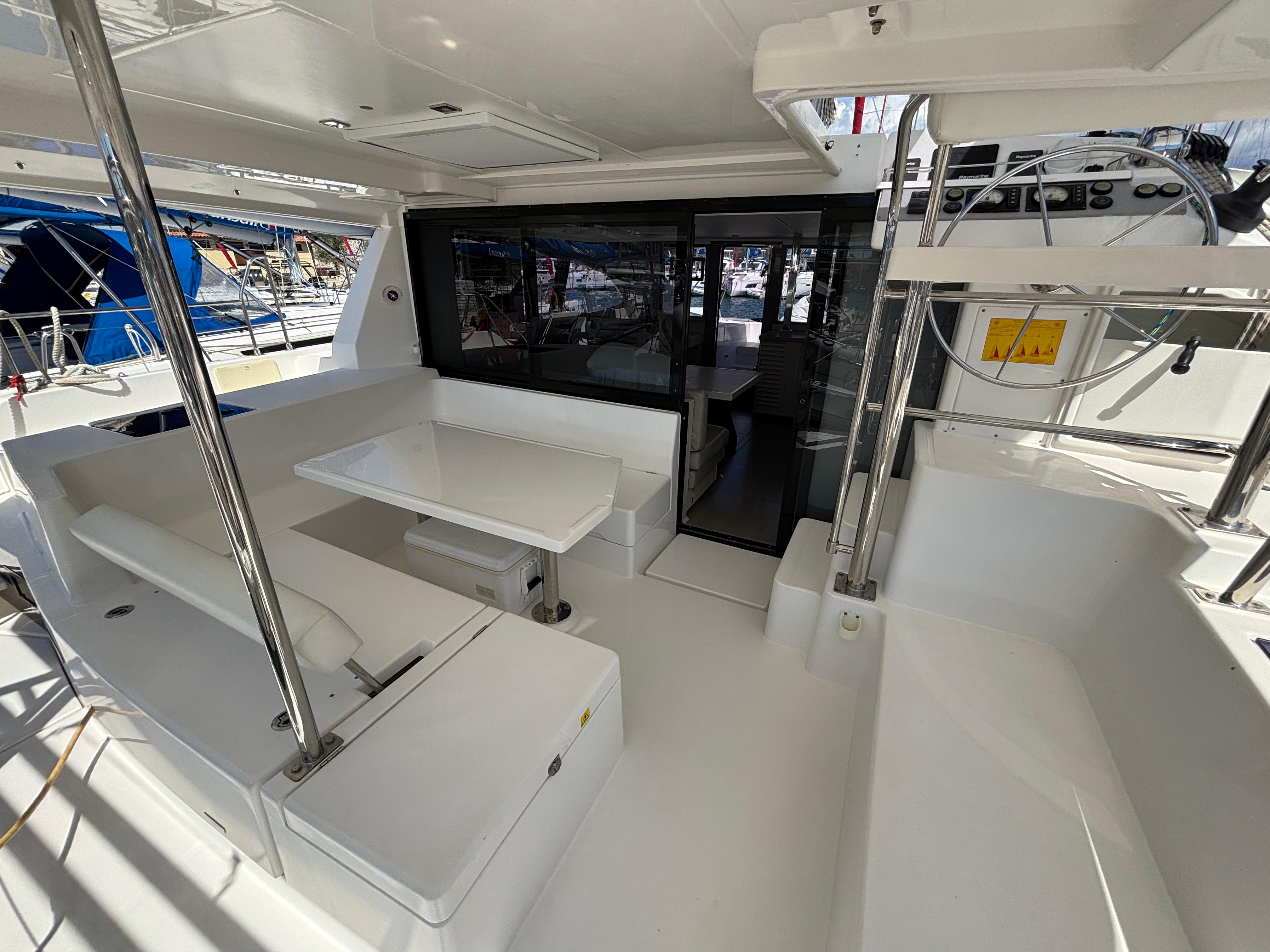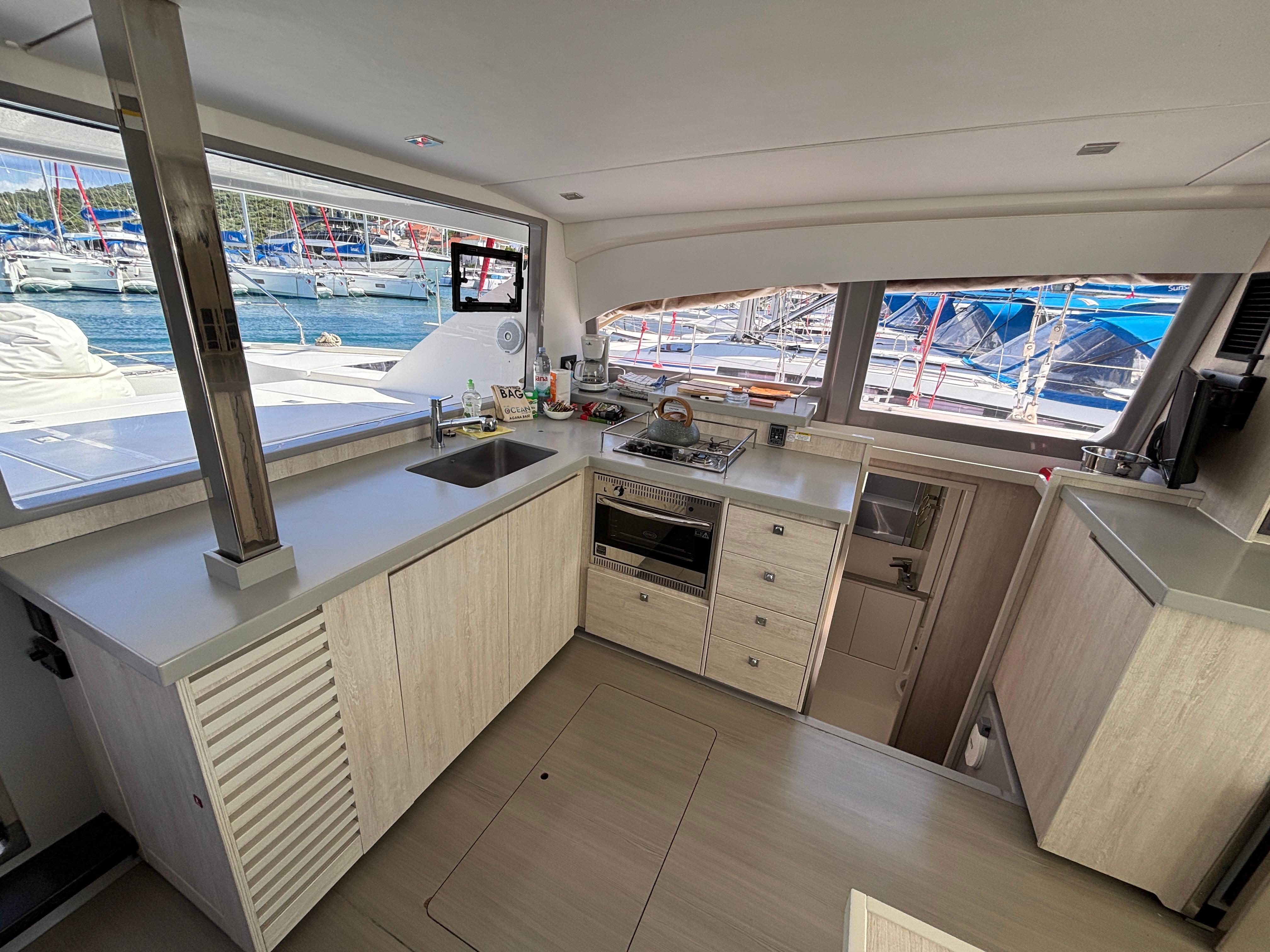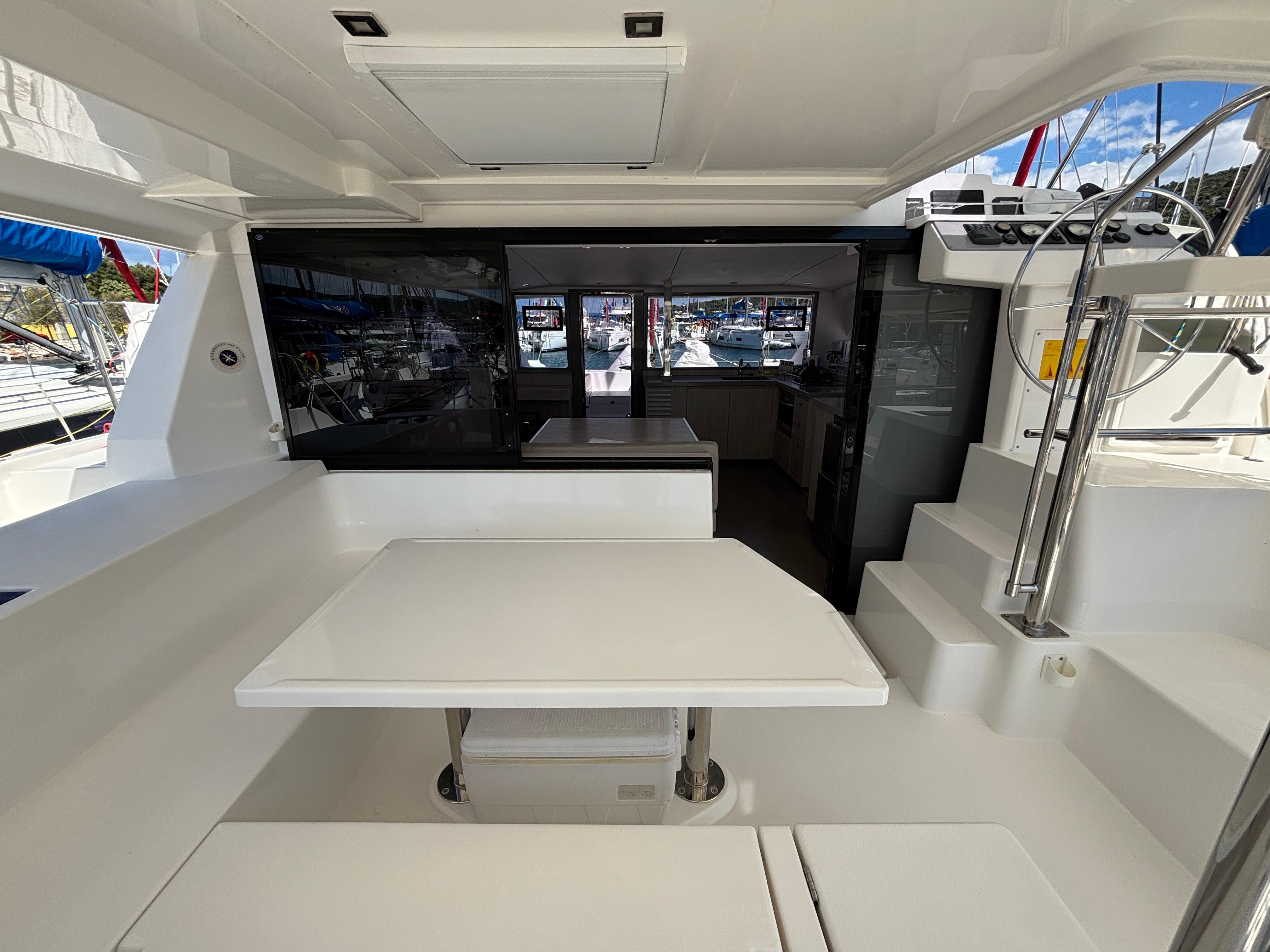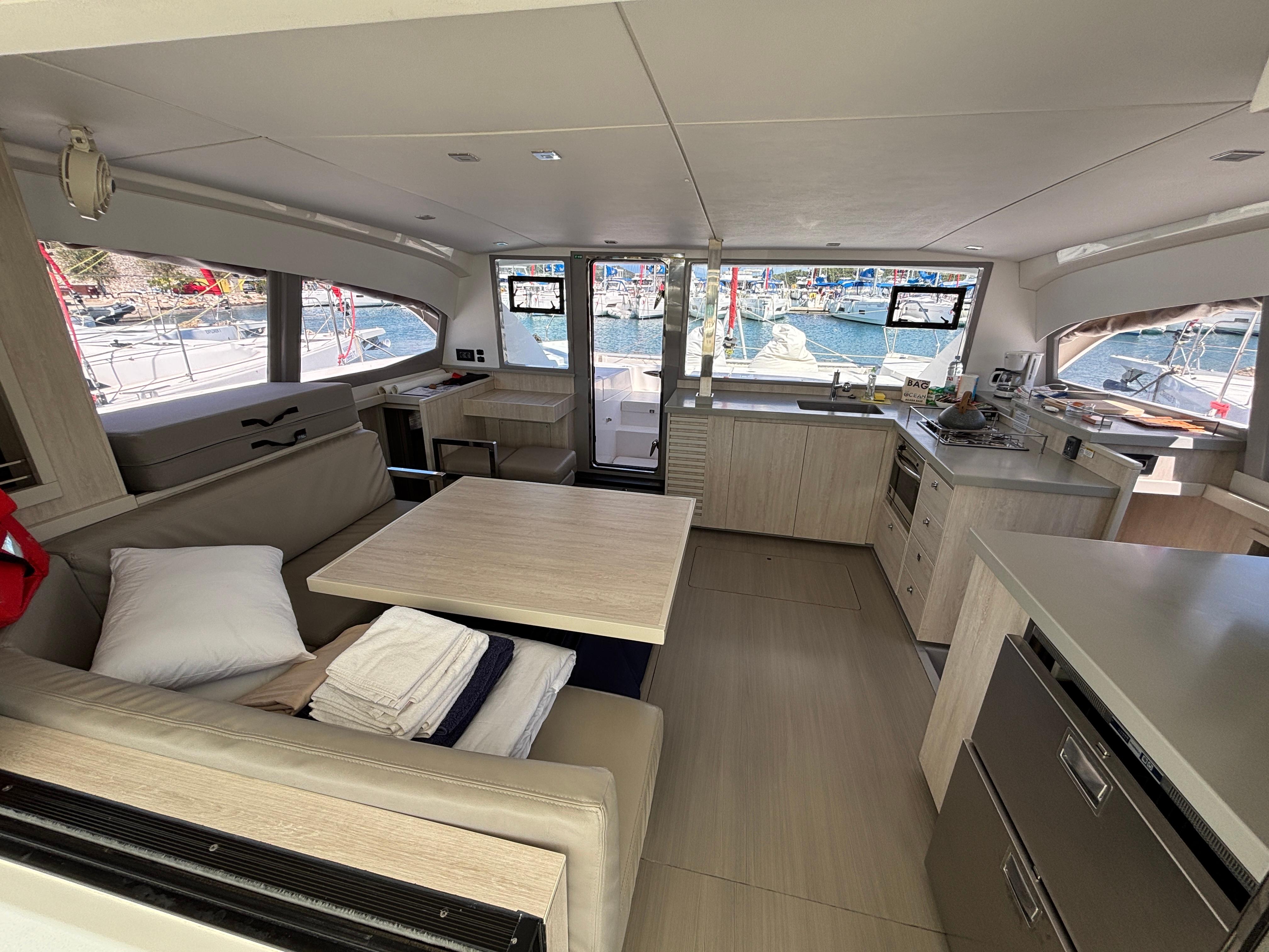BUILDERS REMARKS: Designer/Builders Robertson & Caine and Naval Architects Simonis-Voogd have set a new standard for contemporary cruising catamarans with the launch of the Leopard 40. The innovative interior layout, increased volume in the hulls, and expanded windows and doors that blur the lines between inside and out combine to make the interior space feel like a larger yacht. The unique forward-facing galley stands in front of a large window with an adjacent access door to the forward platform. Aft, a forward-facing settee and dining table are separated from the aft cockpit seating area by sliding glass doors. These doors and windows enhance the open concept feel, allow for exceptional ventilation, and facilitate easy navigation in and around the yacht.