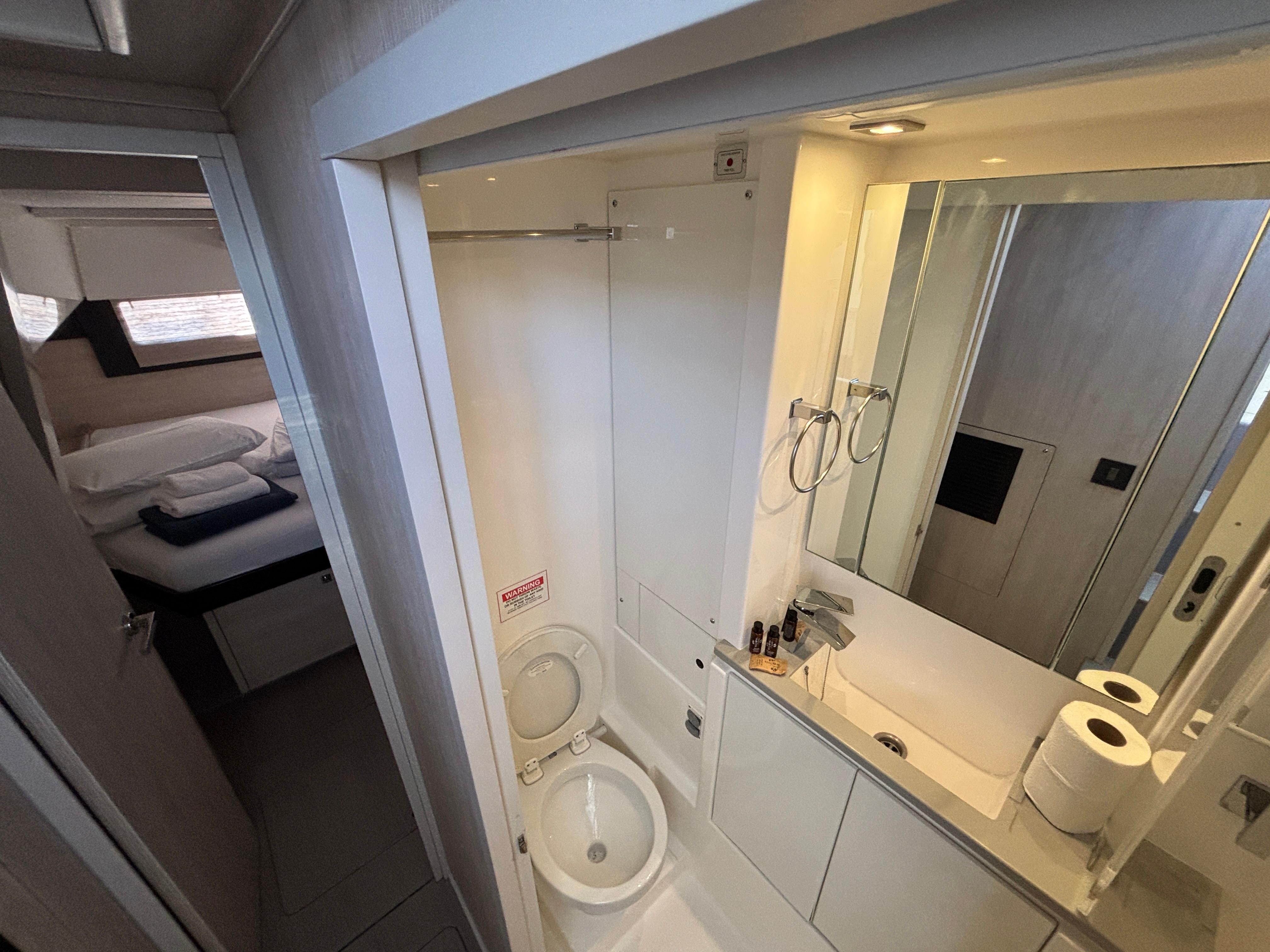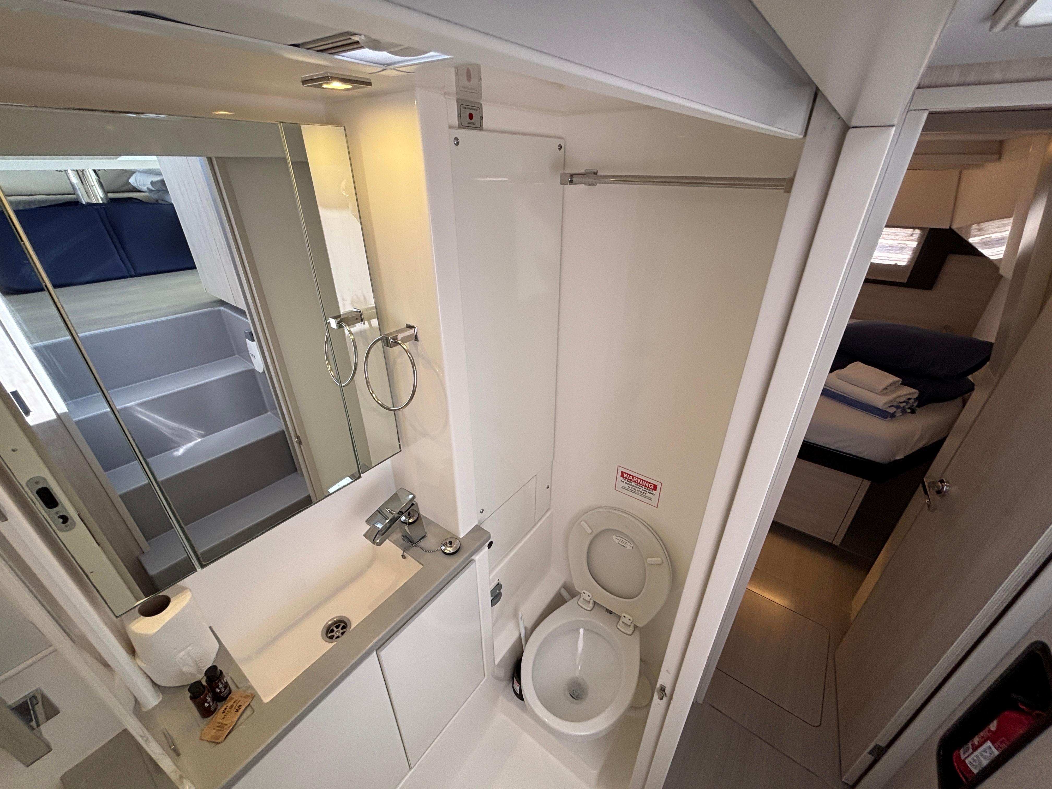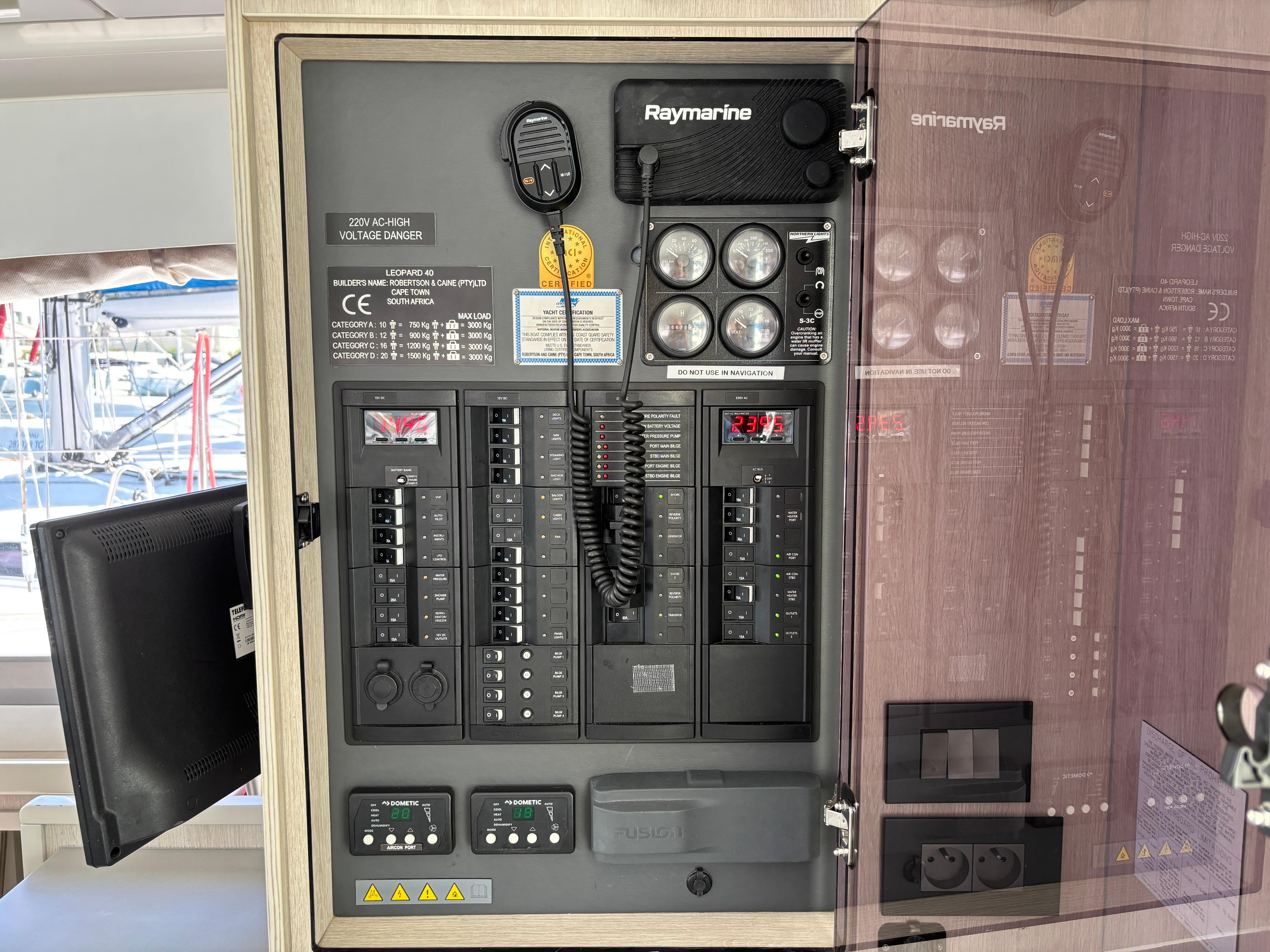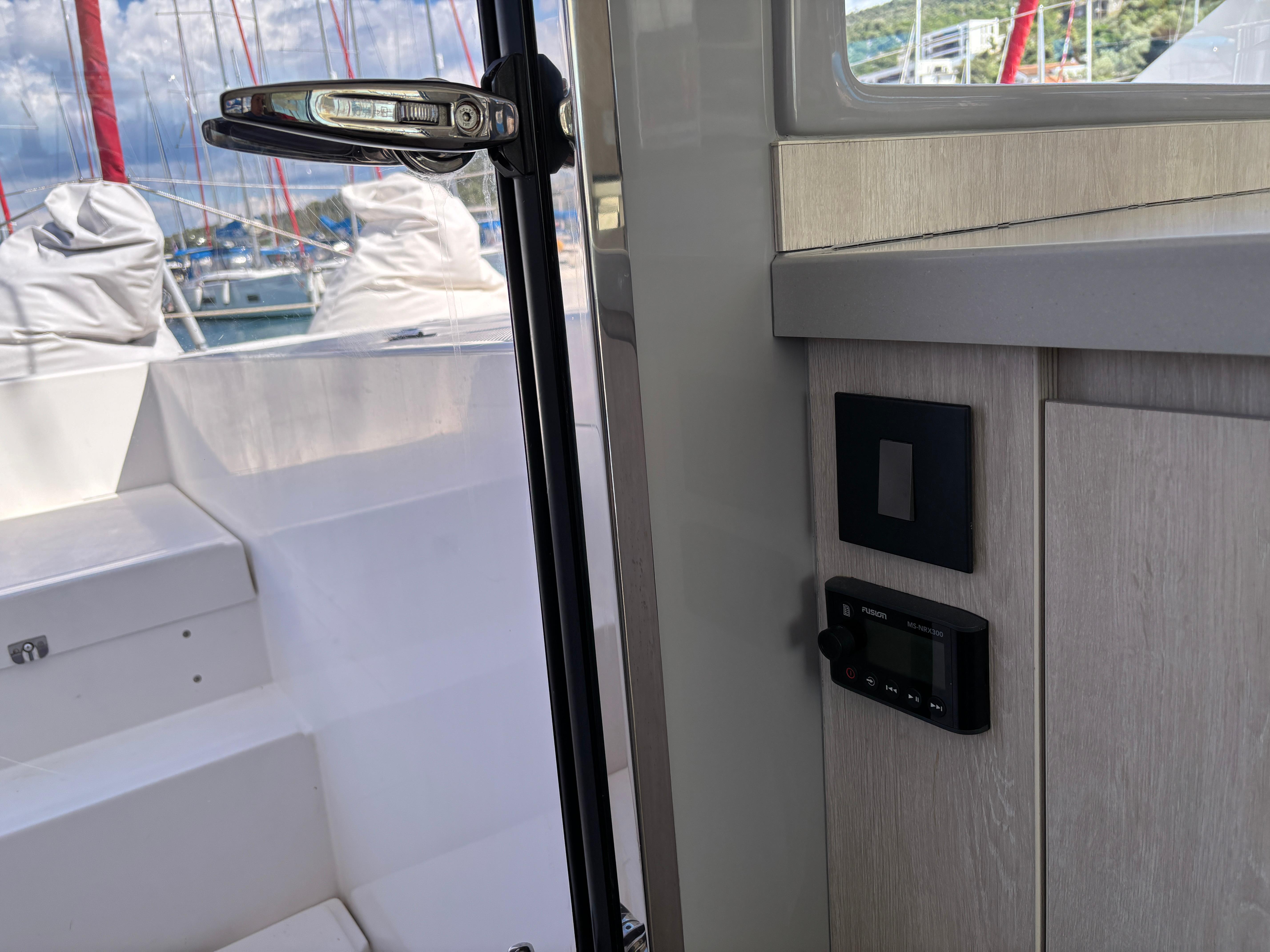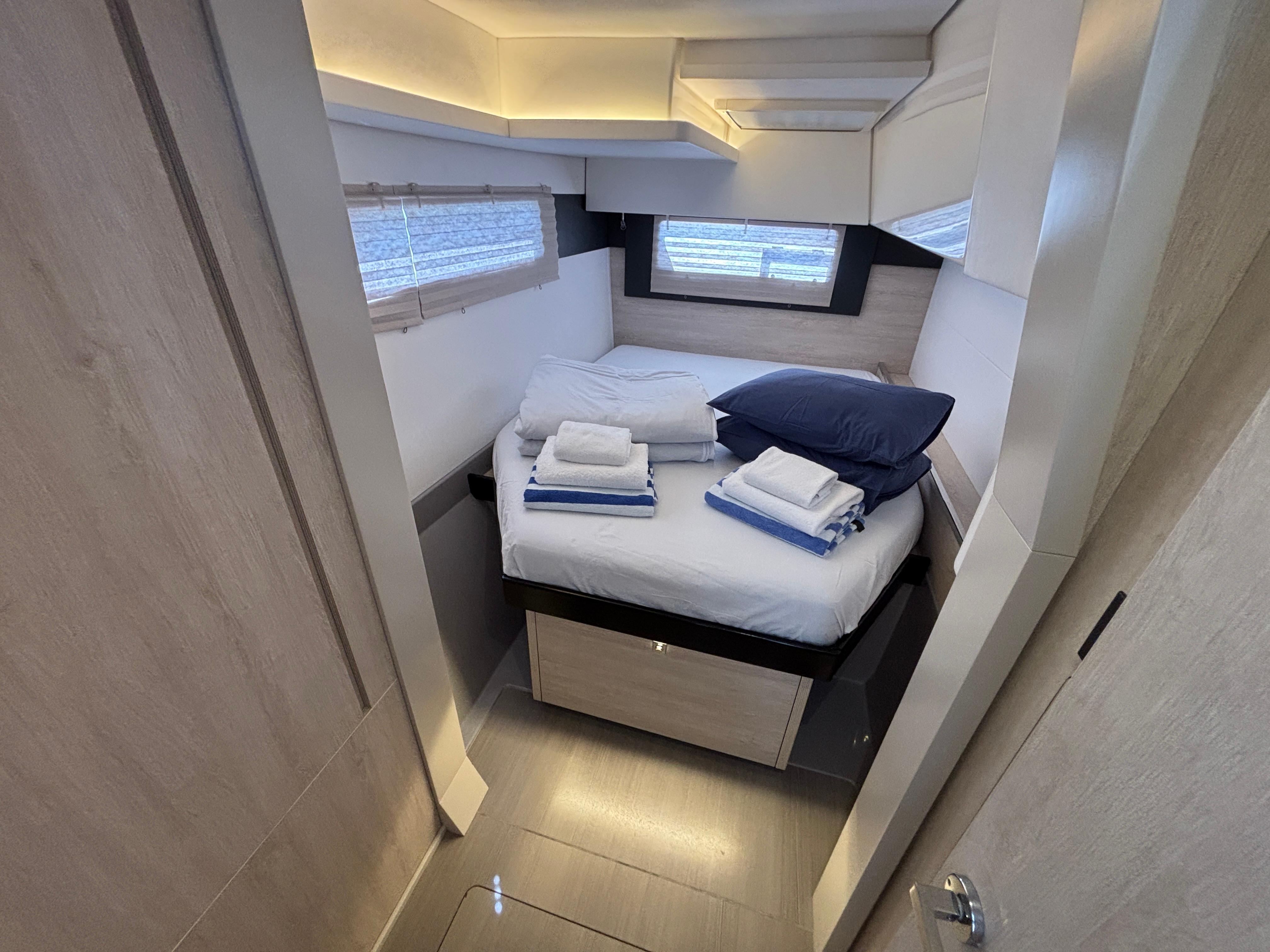 BUILDERS REMARKS: Designer/Builders Robertson & Caine and Naval Architects Simonis-Voogd have set a new standard for contemporary cruising catamarans with the launch of the Leopard 40. The innovative interior layout, increased volume in the hulls, and expanded windows and doors that blur the lines between inside and out combine to make the interior space feel like a larger yacht. The unique forward-facing galley stands in front of a large window with an adjacent access door to the forward platform. Aft, a forward-facing settee and dining table are separated from the aft cockpit seating area by sliding glass doors. These doors and windows enhance the open concept feel, allow for exceptional ventilation, and facilitate easy navigation in and around the yacht.