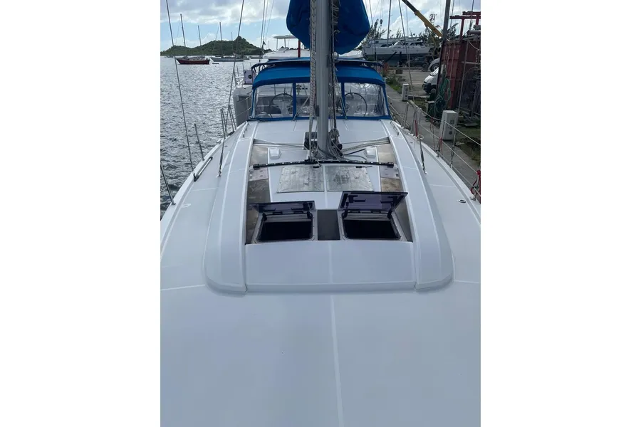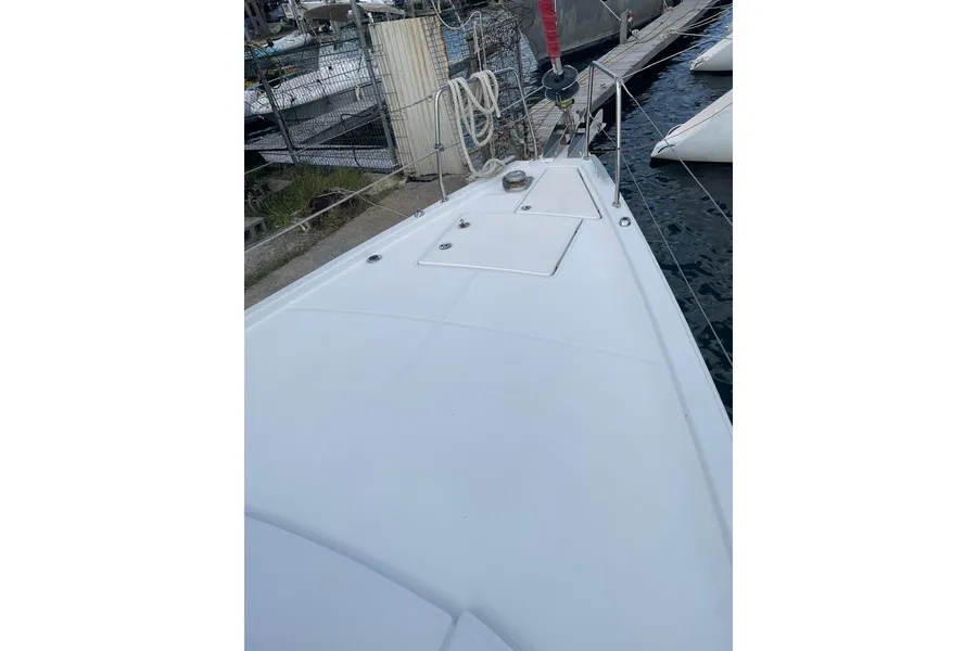 BUILDERS REMARKS: The Moorings 46.3 is boat for demanding owners who are on the lookout for a cruiser which will whet the appetites of both crews and bystanders hanging around the marina. The superb design of the hull is the brainchild of Finot-Conq, the famous naval architects working out of Vannes. They have designed model with a wide-beam, high performance hull, characterized by a novel step one third of the way along, and which is steered by a pair of twin rudders. The uncluttered deck layout and the fact that the hull widens out towards the stern, ensures that the helmsman has a reassuringly clear view of what is going on in front of him.