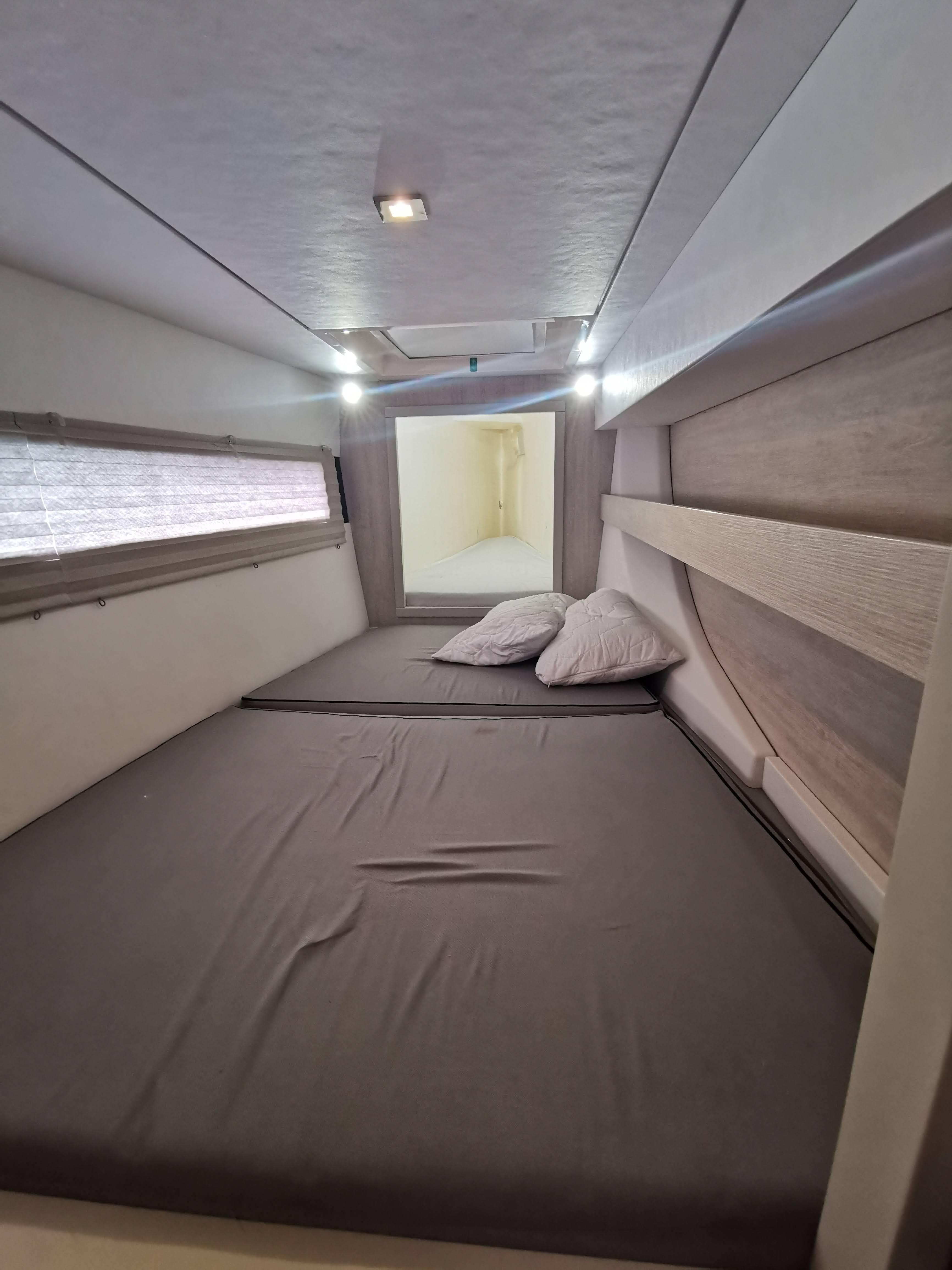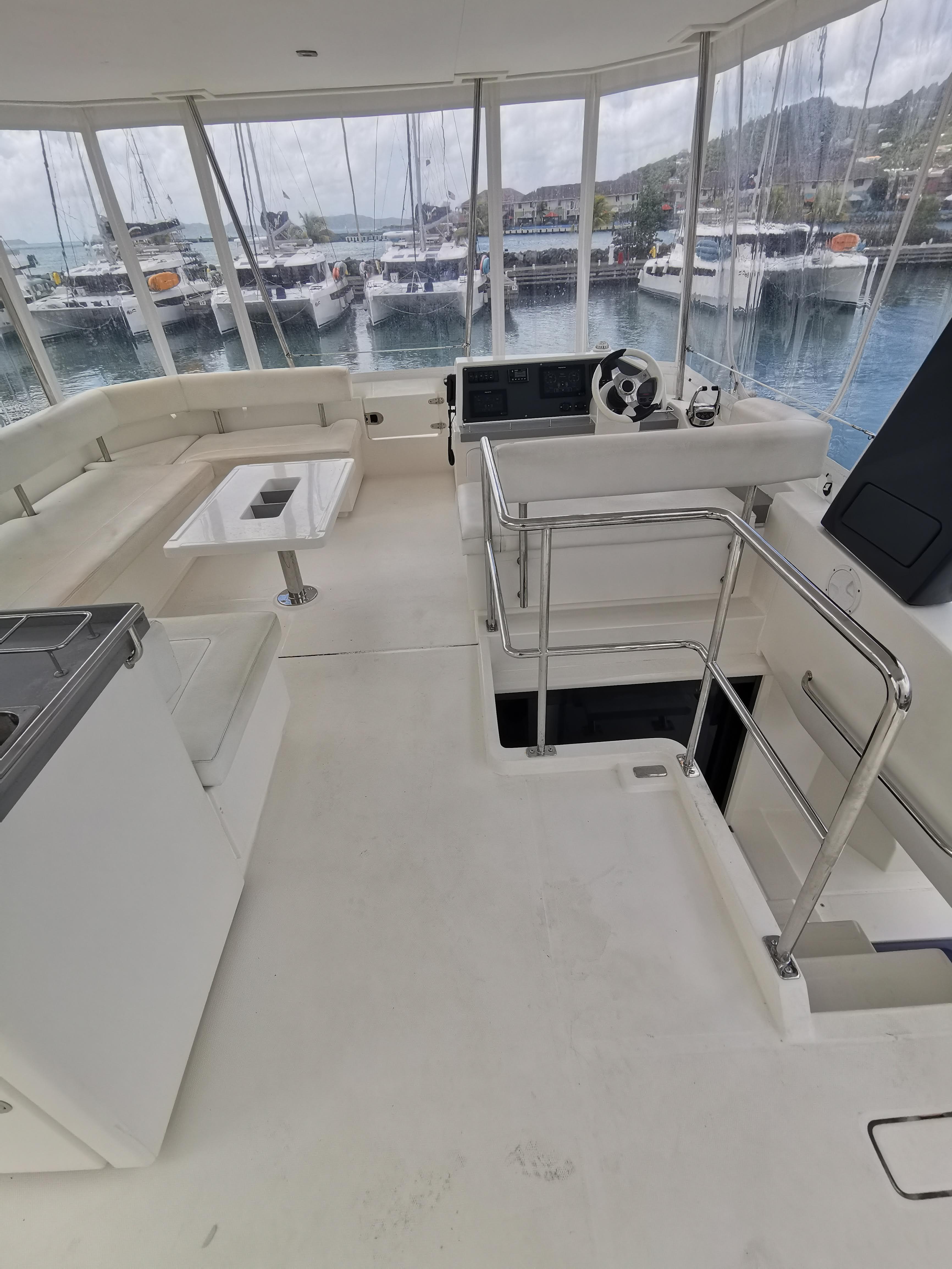 Les coques plus étroites et moins de surface mouillée sous la ligne de flottaison permettent au bateau d’atteindre une vitesse maximale impressionnante de plus de 23 nœuds (27 MPH) et de maintenir une consommation de carburant exceptionnelle en accord avec la marque. Son grand fly-bridge offre une vue à 360 degrés, ce qui rend la navigation facile et sûre. La nouvelle disposition intérieure avec la cuisine située à l’avant et la table et le canapé orientés vers l’avant sont maintenant situés à l’arrière. La coque tribord est entièrement dédiée à la suite du propriétaire avec une cabine principale spacieuse et une salle d’eau privée avec un grand compartiment douche séparé dans la partie avant de la coque. L’intérieur blond clair est bien visible dans tout le bateau, y compris dans les cabines d’invités, ce qui ajoute à l’impression d’espace.