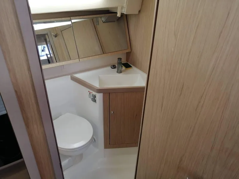 With its double door, bed head facing forward and the choice of an ensuite bathroom, the master cabin is unquestionably the most attractive feature of the Oceanis 41.1. The master cabin has a single door because of the en-suite bathroom.