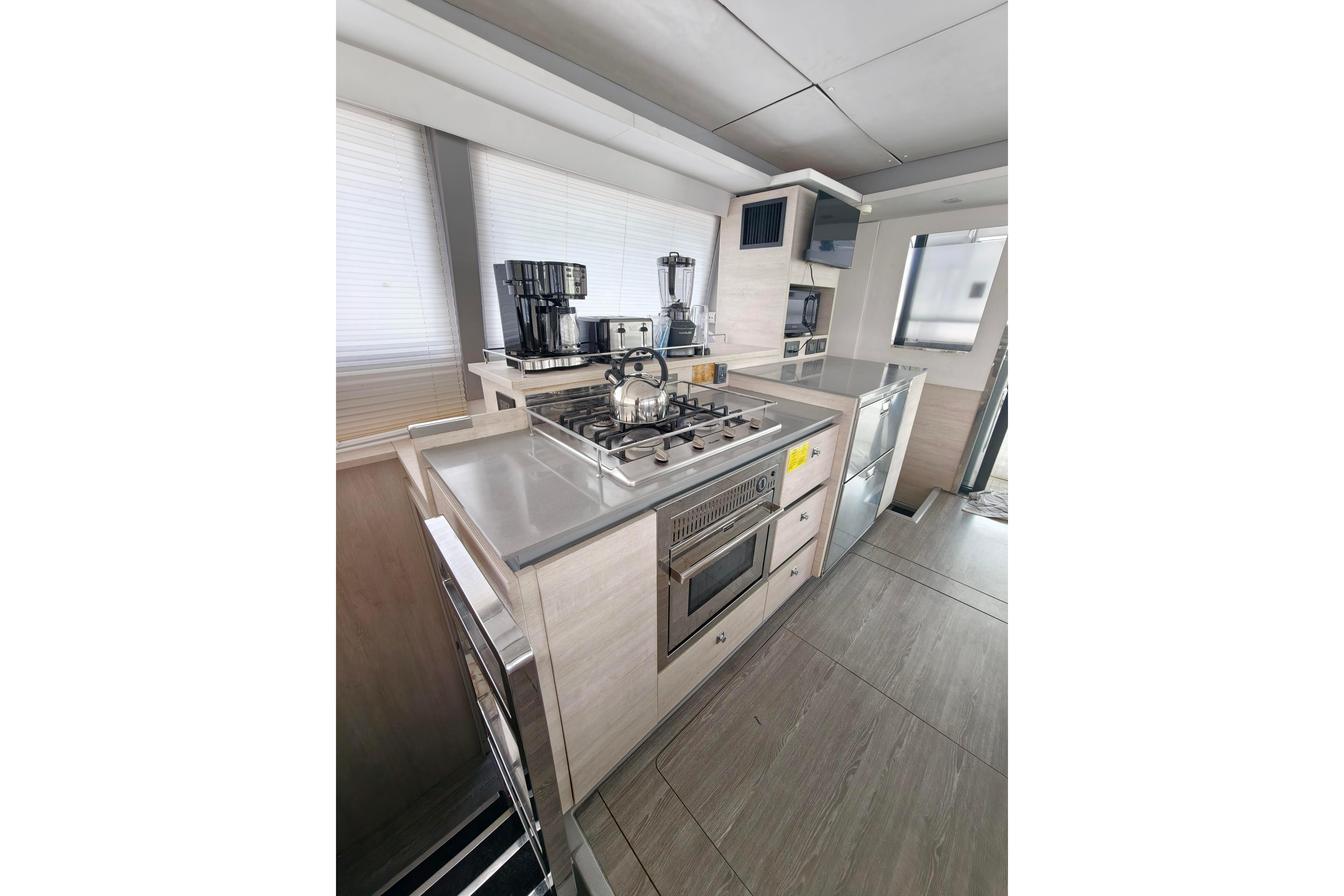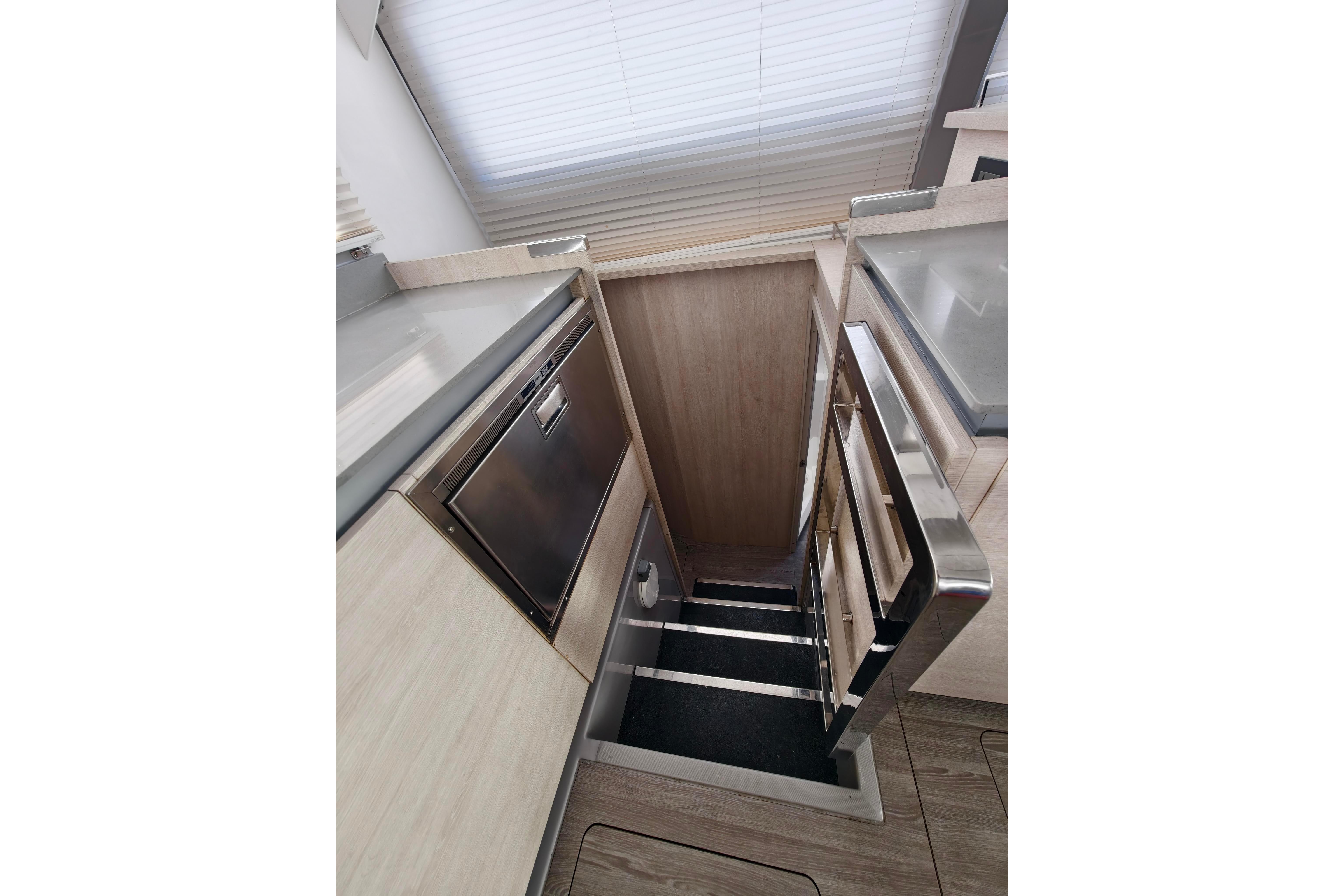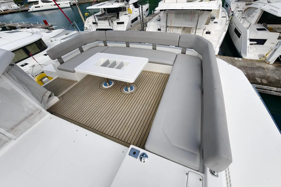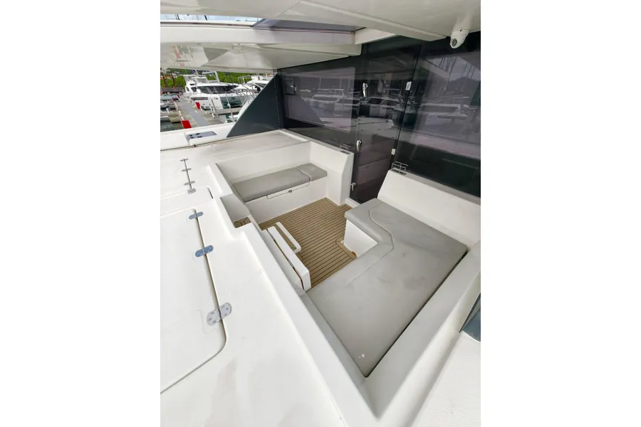 The Leopard 50 has the ideal layout for anyone looking for more outdoor living space as she comes equipped with a flybridge that includes a lounge area, table, sunbed and optional exterior speakers and shade awning. Access is provided by floating stairs leading up from the aft cockpit. An important distinction compared to similar sailboat flybridge configurations is that while under sail, passengers can move about the flybridge with ample headroom and never worry about interference from the boom. The flybridge is also situated to still maintain contact with the helm station, an important feature found on all Leopard Catamarans.