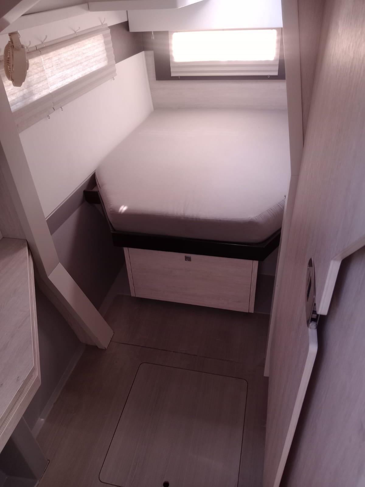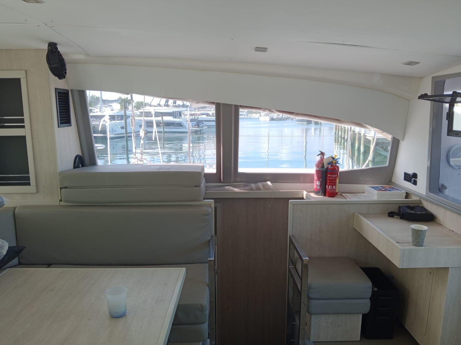 BUILDERS REMARKS: The Leopard 40, a product of South African boat builders Robertson & Caine, features a unique, modern design thanks to experienced naval architects Simonis and Voogd as well as Robertson & Caine’s design team. She resembles her predecessors in speed, agility, and blue-water performance, but her enhancements include an increased hull volume and an innovative interior layout, which is unlike any Leopard before her. Her galley is located forward and the forward-facing settee and window and an access door to the forward platform of the boat. This allows for a panoramic view with large sliding glass doors between the saloon and the aft cockpit. This arrangement promotes easy communication for guests and an open flow between the saloon and the aft cockpit, creating a fusion of indoor and outdoor living space.