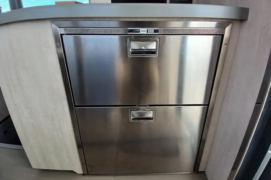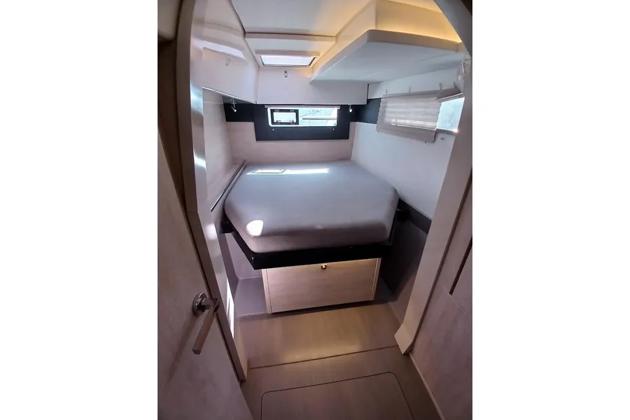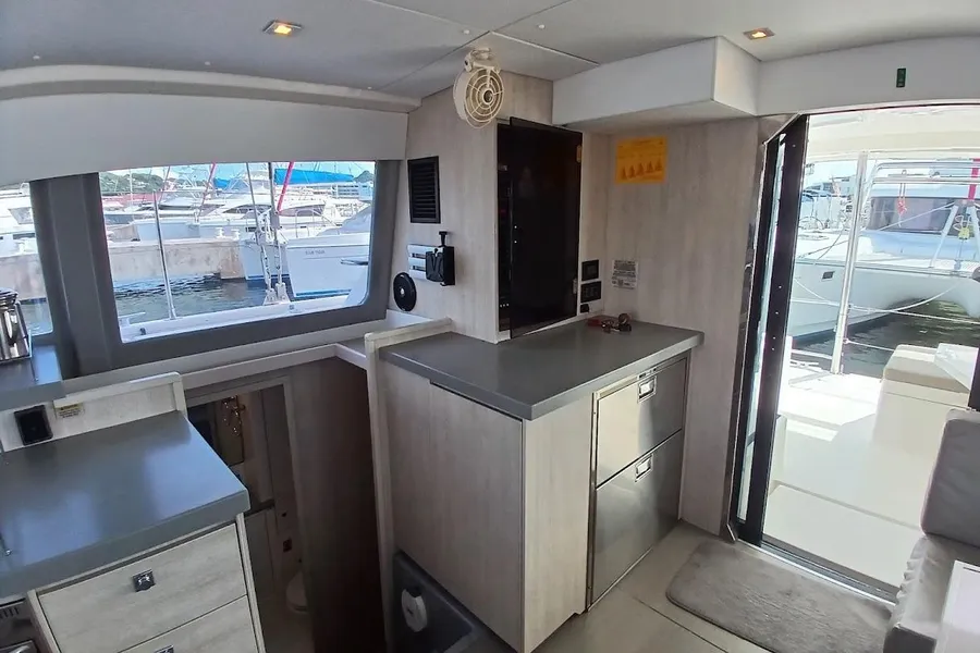 BUILDERS REMARKS: The Leopard 40, a product of South African boat builders Robertson & Caine, features a unique, modern design thanks to experienced naval architects Simonis and Voogd as well as Robertson & Caine’s design team. She resembles her predecessors in speed, agility, and blue-water performance, but her enhancements include an increased hull volume and an innovative interior layout, which is unlike any Leopard before her. Her galley is located forward and the forward-facing settee and window and an access door to the forward platform of the boat. This allows for a panoramic view with large sliding glass doors between the saloon and the aft cockpit. This arrangement promotes easy communication for guests and an open flow between the saloon and the aft cockpit, creating a fusion of indoor and outdoor living space.