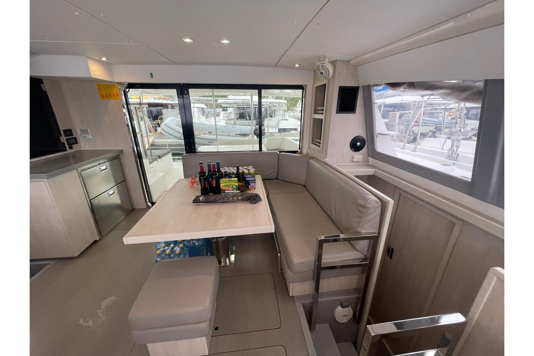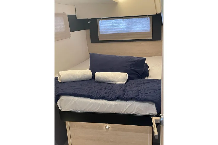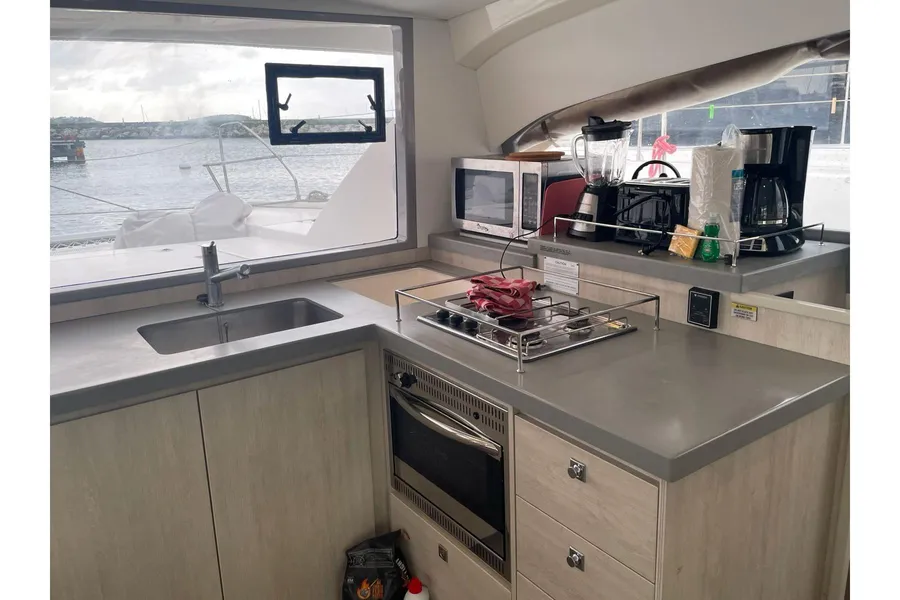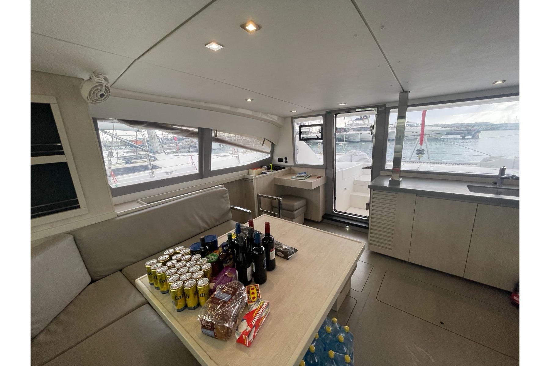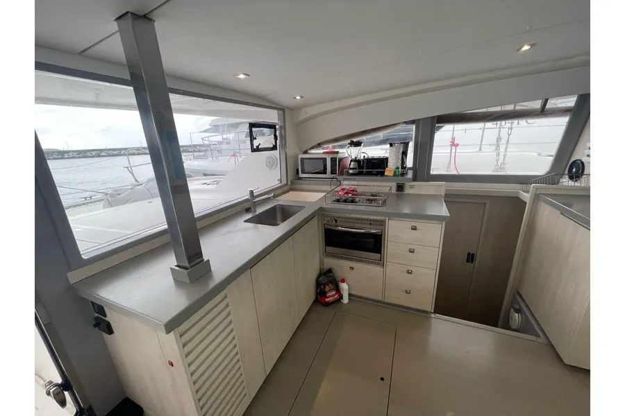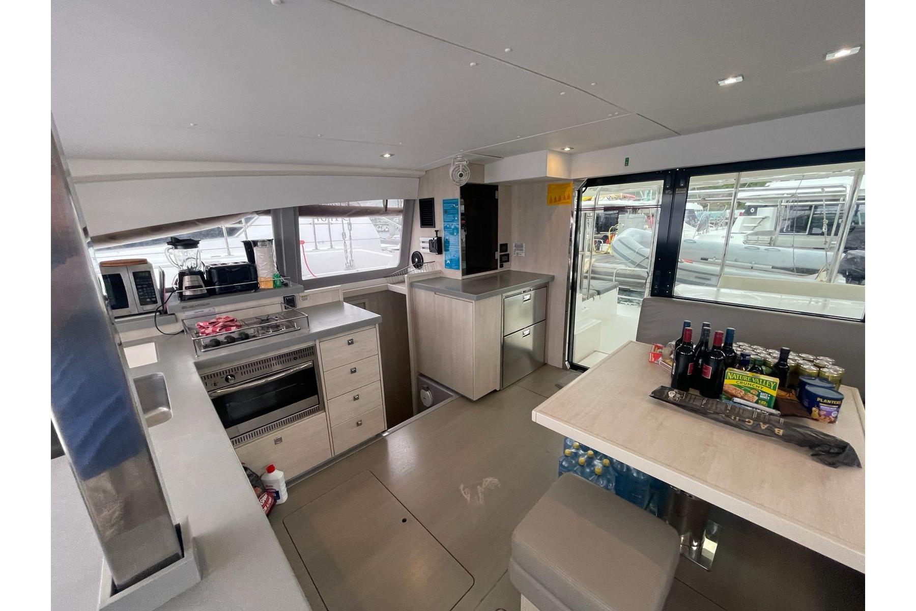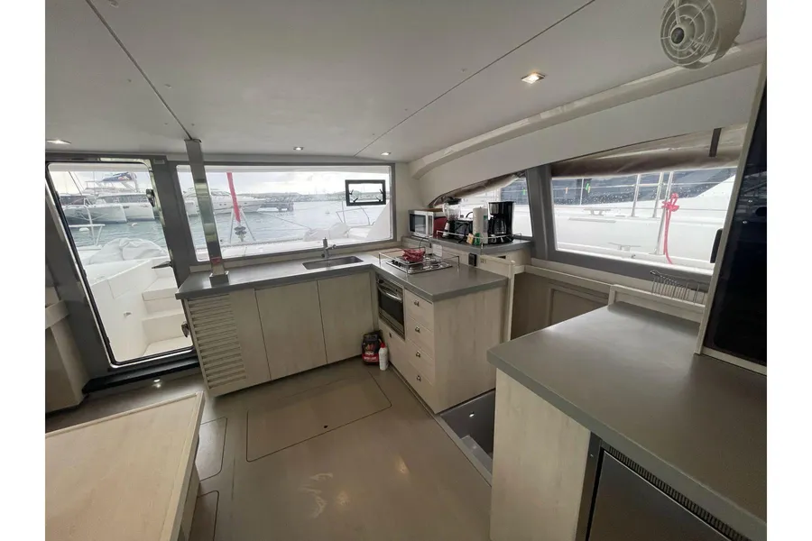 BUILDERS REMARKS: The Leopard 40, a product of South African boat builders Robertson & Caine, features a unique, modern design thanks to experienced naval architects Simonis and Voogd as well as Robertson & Caine’s design team. She resembles her predecessors in speed, agility, and blue-water performance, but her enhancements include an increased hull volume and an innovative interior layout, which is unlike any Leopard before her. Her galley is located forward and the forward-facing settee and window and an access door to the forward platform of the boat. This allows for a panoramic view with large sliding glass doors between the saloon and the aft cockpit. This arrangement promotes easy communication for guests and an open flow between the saloon and the aft cockpit, creating a fusion of indoor and outdoor living space.