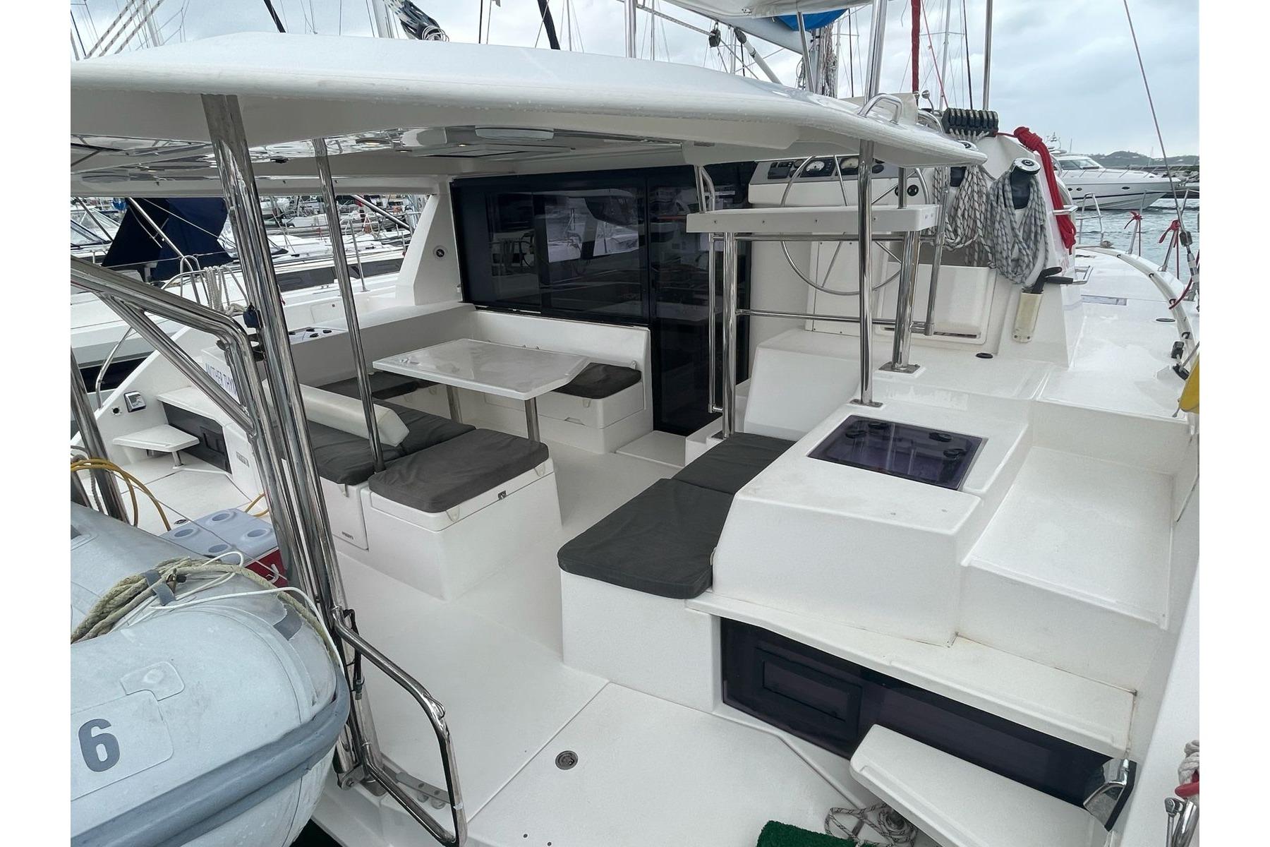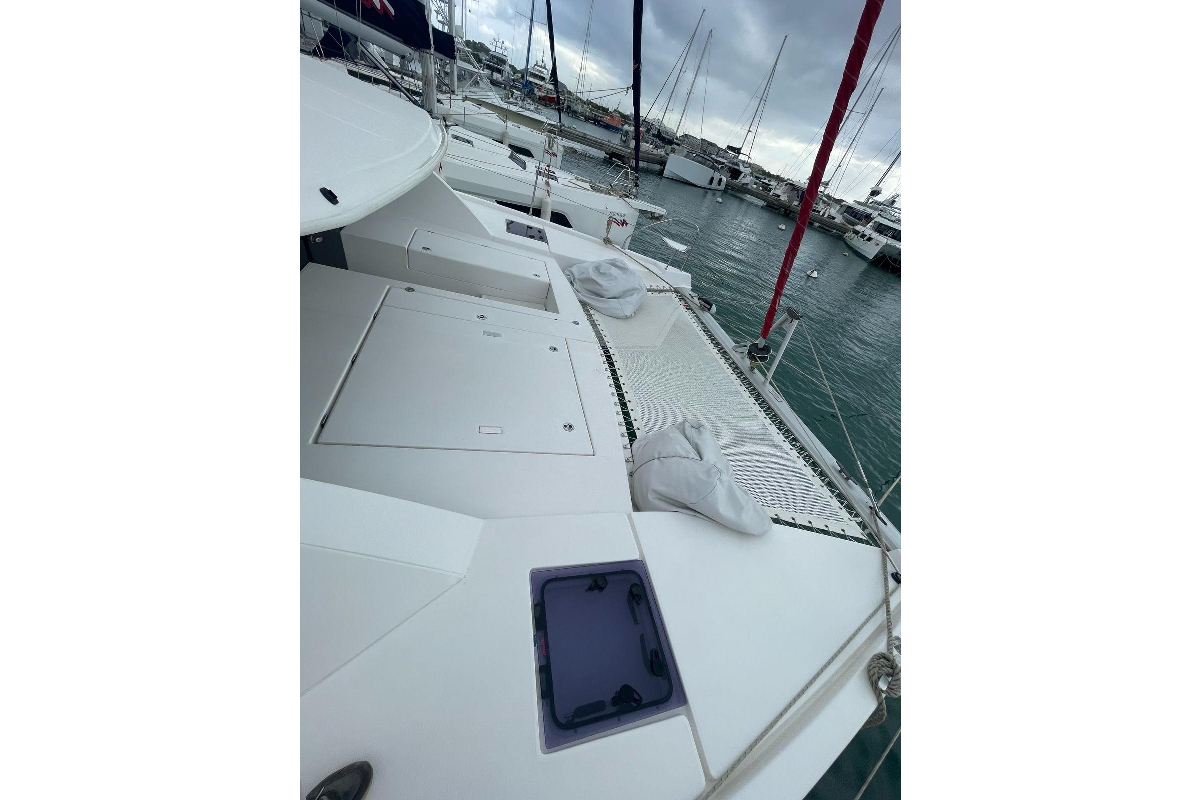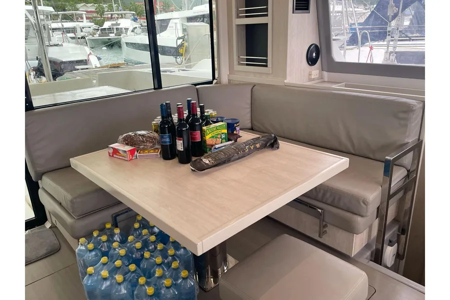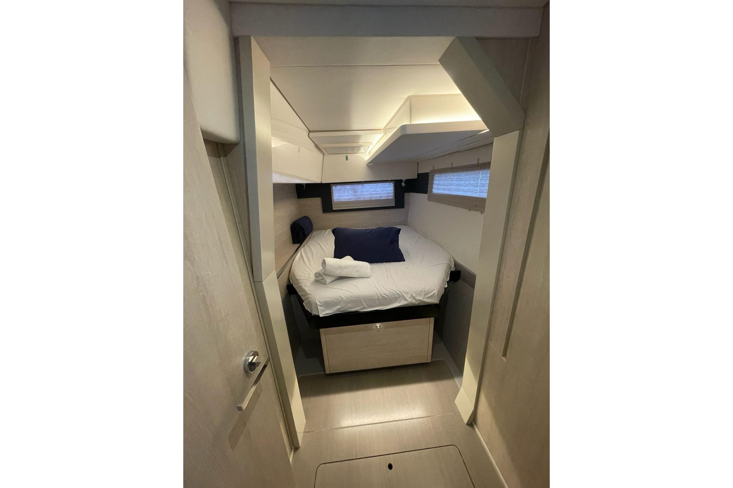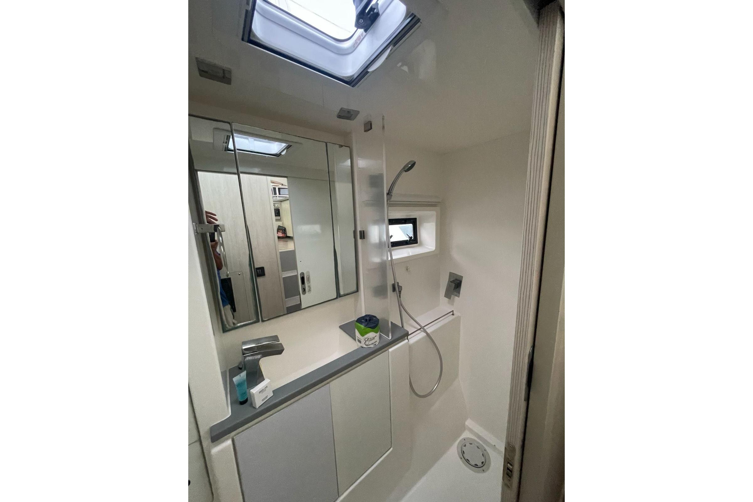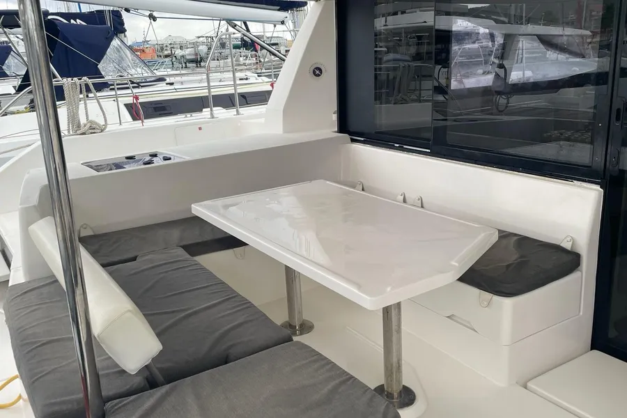 BUILDERS REMARKS: The Leopard 40, a product of South African boat builders Robertson & Caine, features a unique, modern design thanks to experienced naval architects Simonis and Voogd as well as Robertson & Caine’s design team. She resembles her predecessors in speed, agility, and blue-water performance, but her enhancements include an increased hull volume and an innovative interior layout, which is unlike any Leopard before her. Her galley is located forward and the forward-facing settee and window and an access door to the forward platform of the boat. This allows for a panoramic view with large sliding glass doors between the saloon and the aft cockpit. This arrangement promotes easy communication for guests and an open flow between the saloon and the aft cockpit, creating a fusion of indoor and outdoor living space.