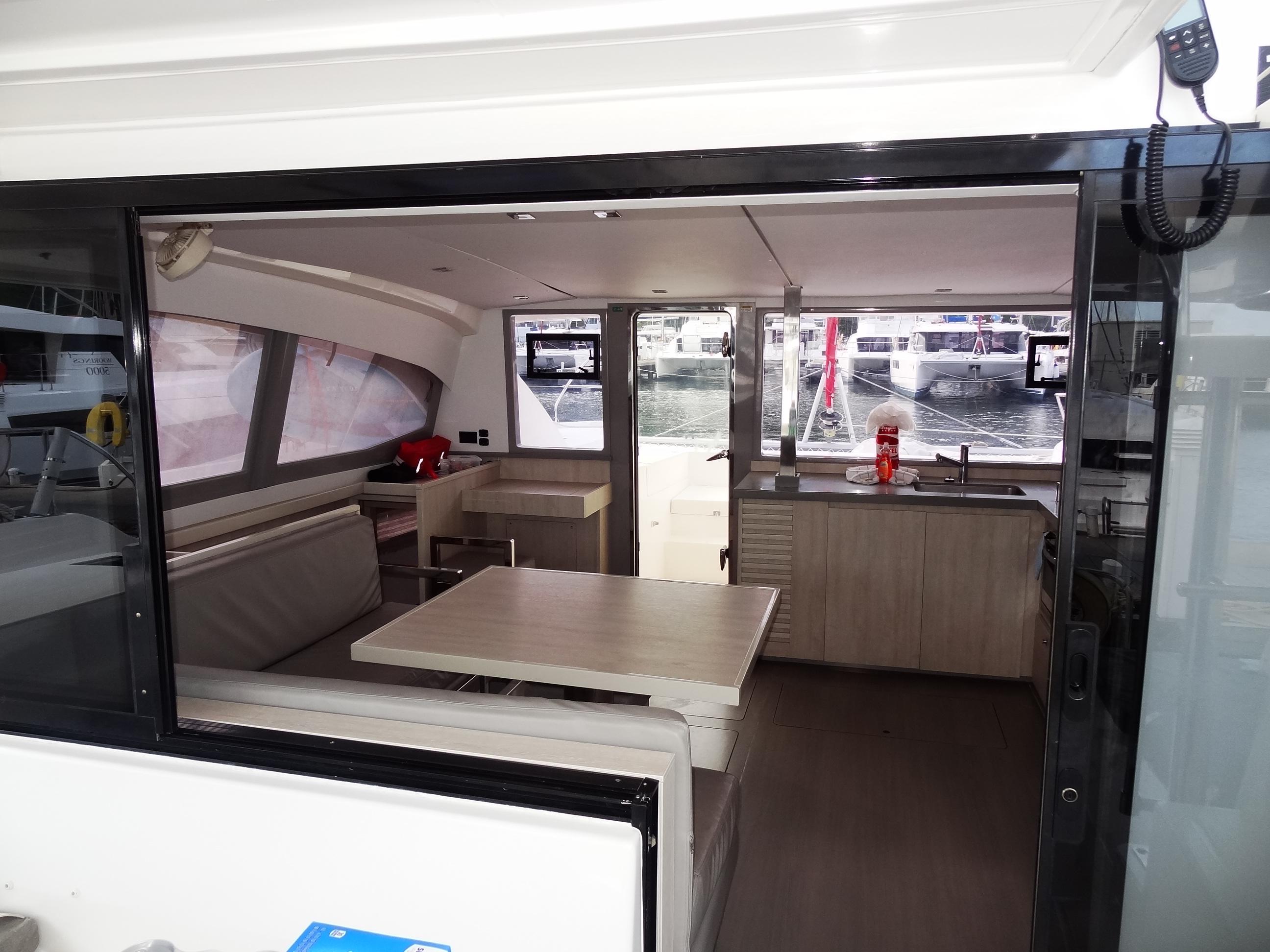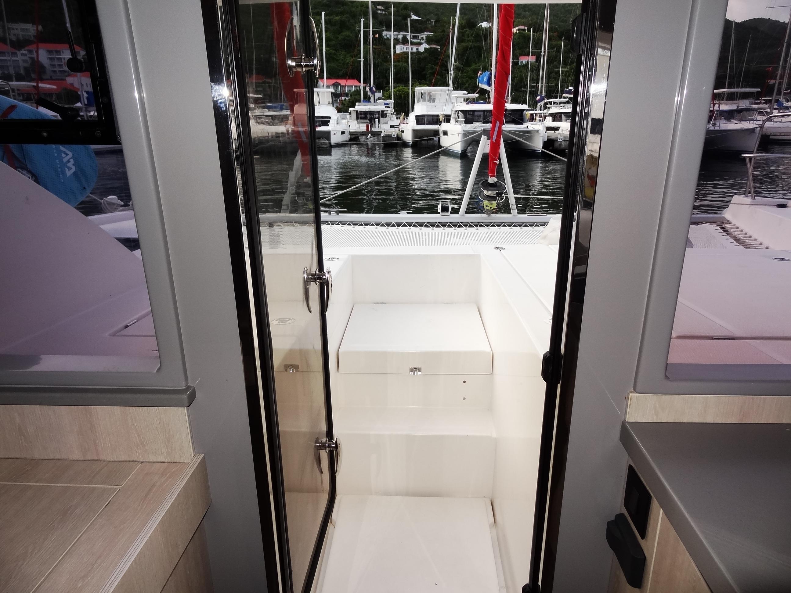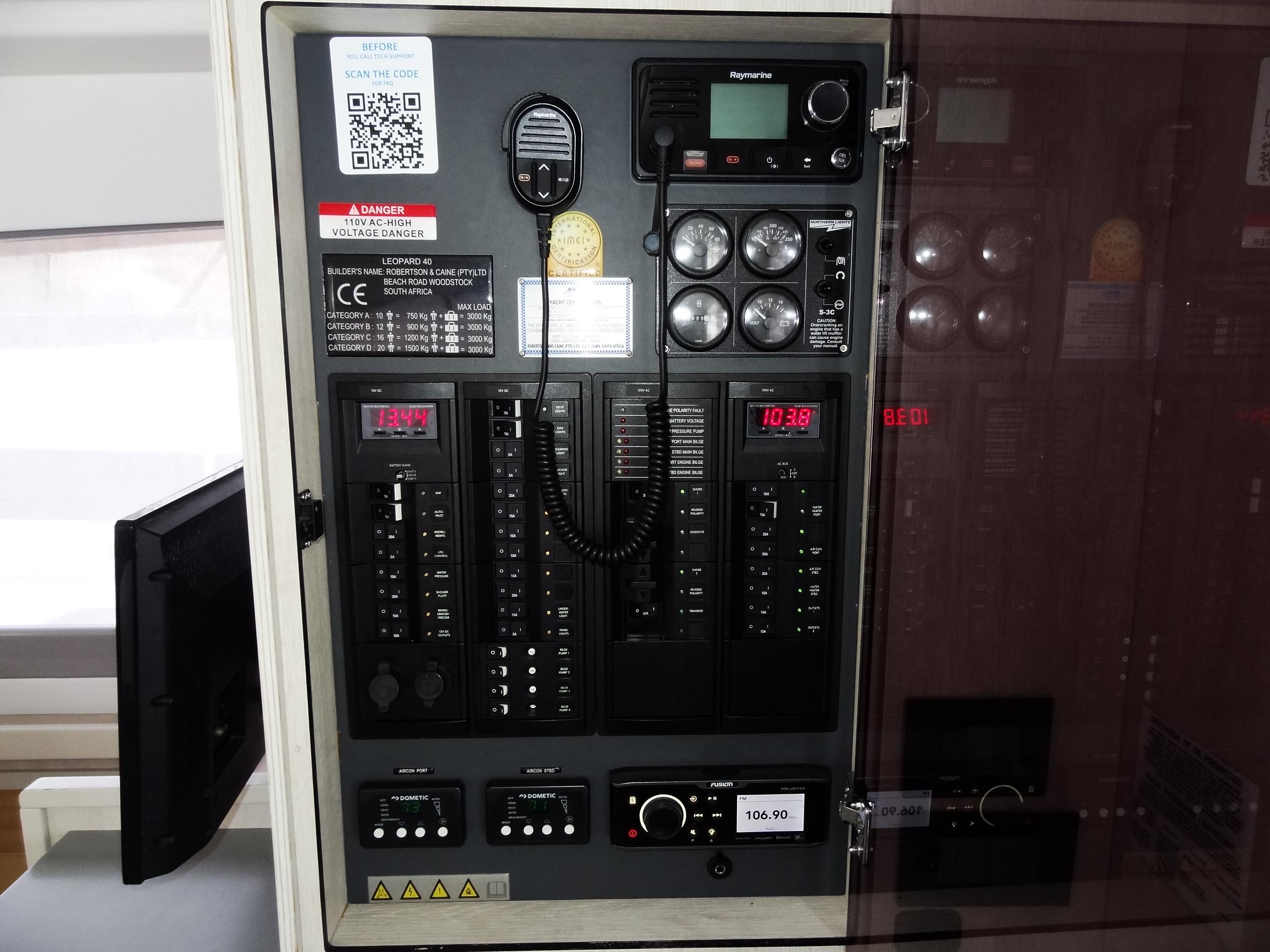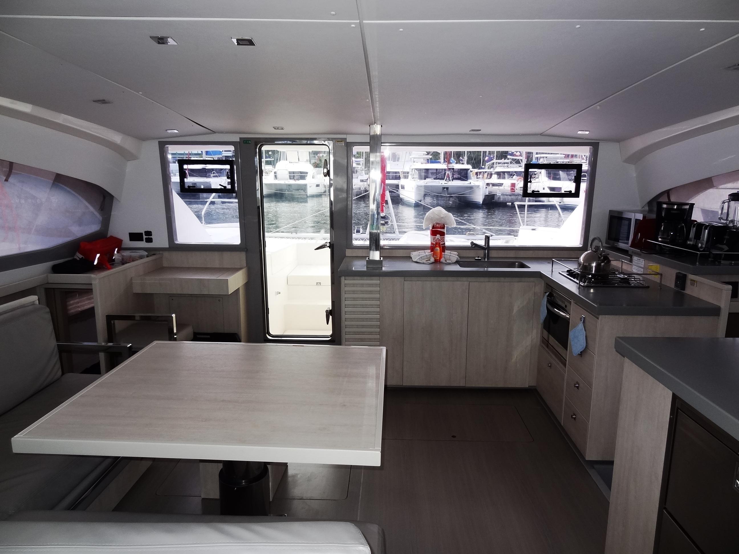 BUILDERS REMARKS: The Leopard 40, a product of South African boat builders Robertson & Caine, features a unique, modern design thanks to experienced naval architects Simonis and Voogd as well as Robertson & Caine’s design team. She resembles her predecessors in speed, agility, and blue-water performance, but her enhancements include an increased hull volume and an innovative interior layout, which is unlike any Leopard before her. Her galley is located forward and the forward-facing settee and window and an access door to the forward platform of the boat. This allows for a panoramic view with large sliding glass doors between the saloon and the aft cockpit. This arrangement promotes easy communication for guests and an open flow between the saloon and the aft cockpit, creating a fusion of indoor and outdoor living space.