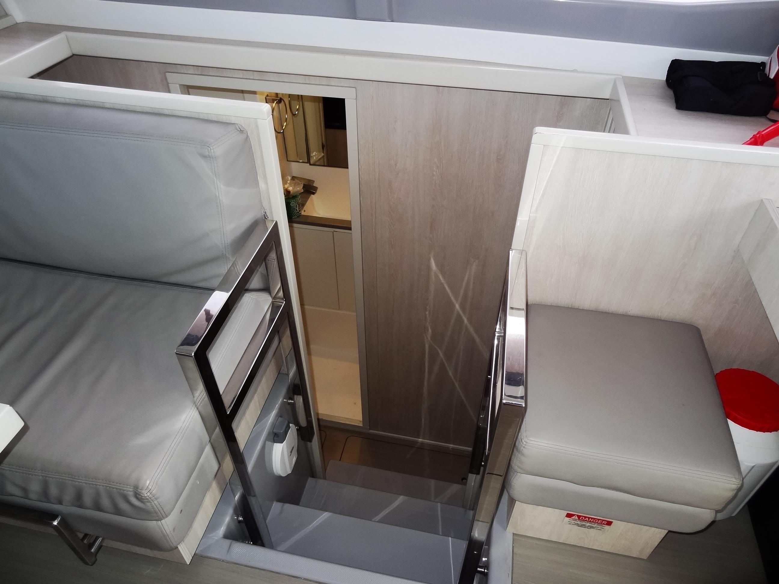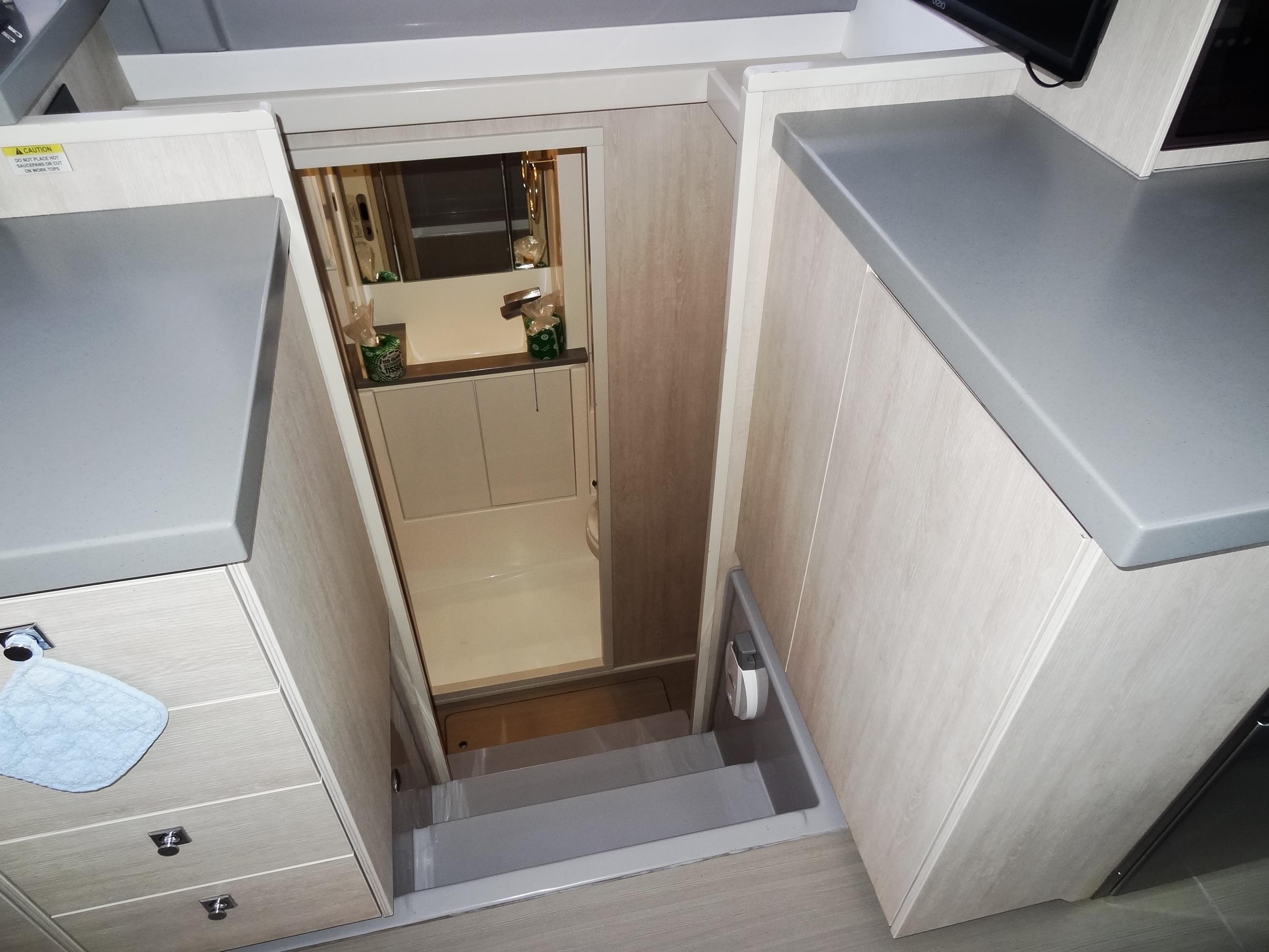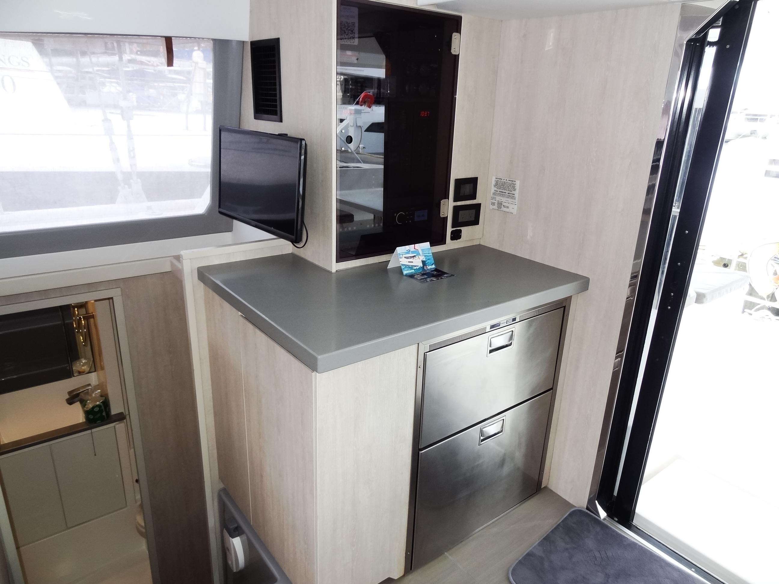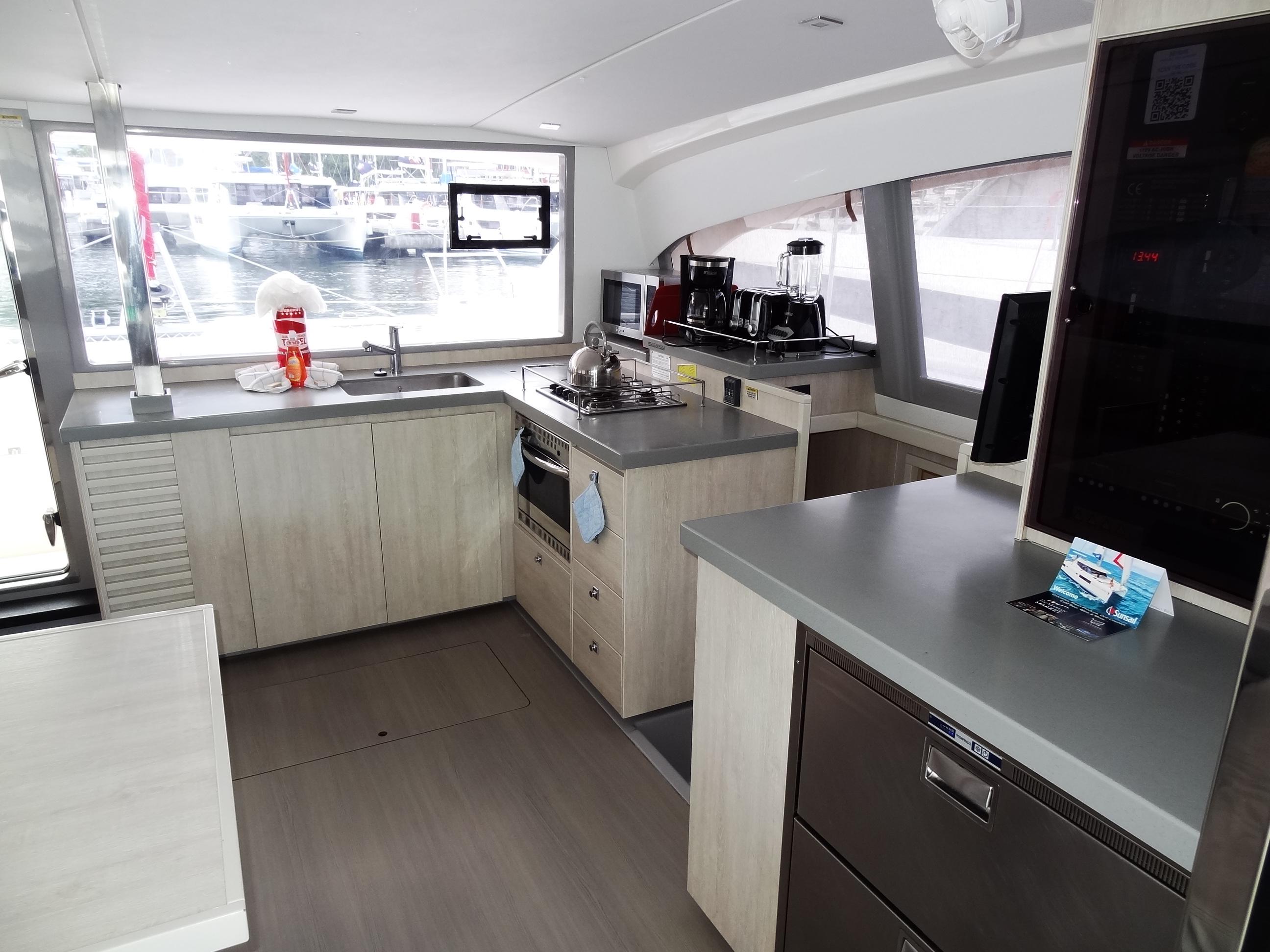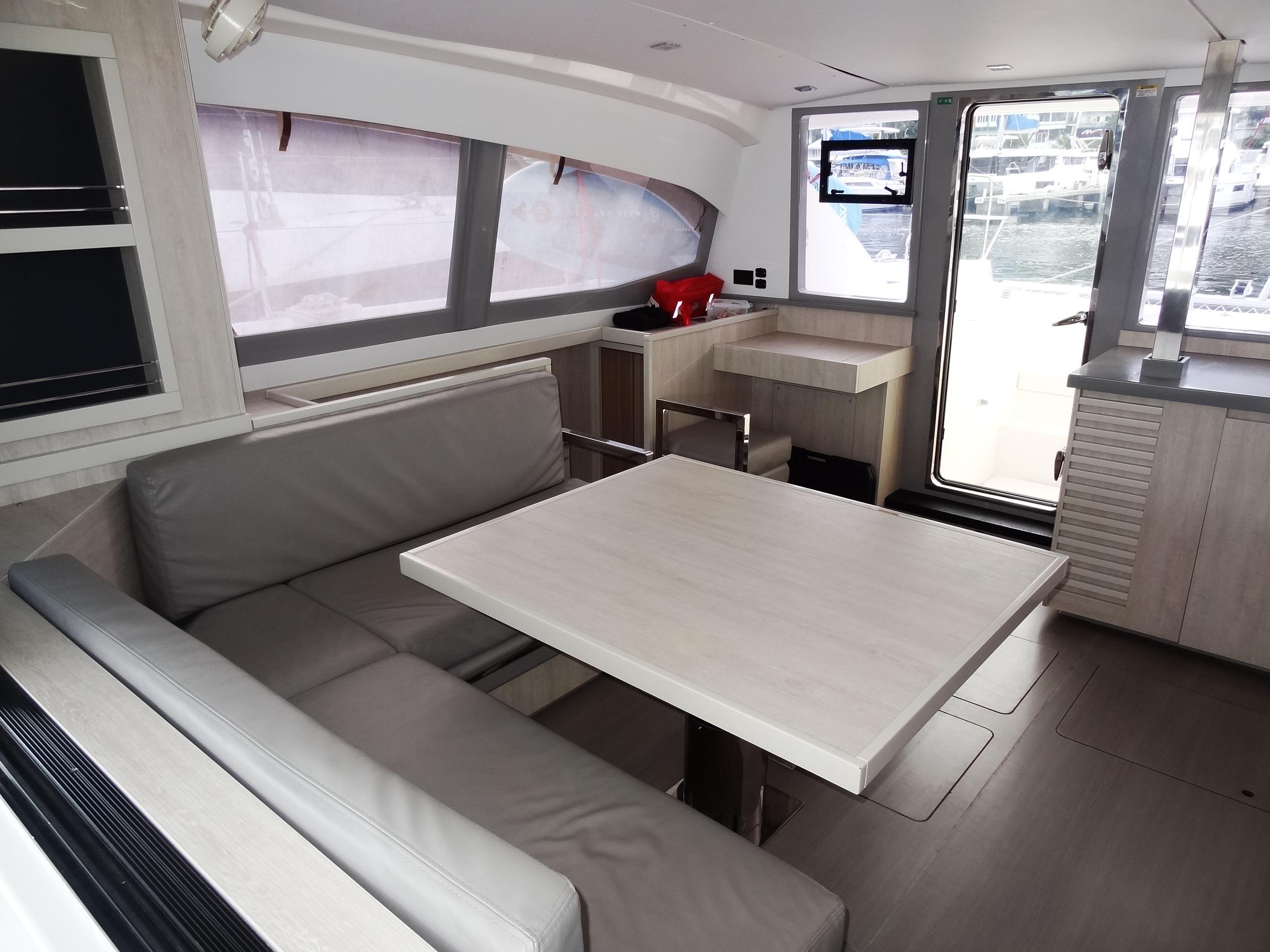 BUILDERS REMARKS: The Leopard 40, a product of South African boat builders Robertson & Caine, features a unique, modern design thanks to experienced naval architects Simonis and Voogd as well as Robertson & Caine’s design team. She resembles her predecessors in speed, agility, and blue-water performance, but her enhancements include an increased hull volume and an innovative interior layout, which is unlike any Leopard before her. Her galley is located forward and the forward-facing settee and window and an access door to the forward platform of the boat. This allows for a panoramic view with large sliding glass doors between the saloon and the aft cockpit. This arrangement promotes easy communication for guests and an open flow between the saloon and the aft cockpit, creating a fusion of indoor and outdoor living space.