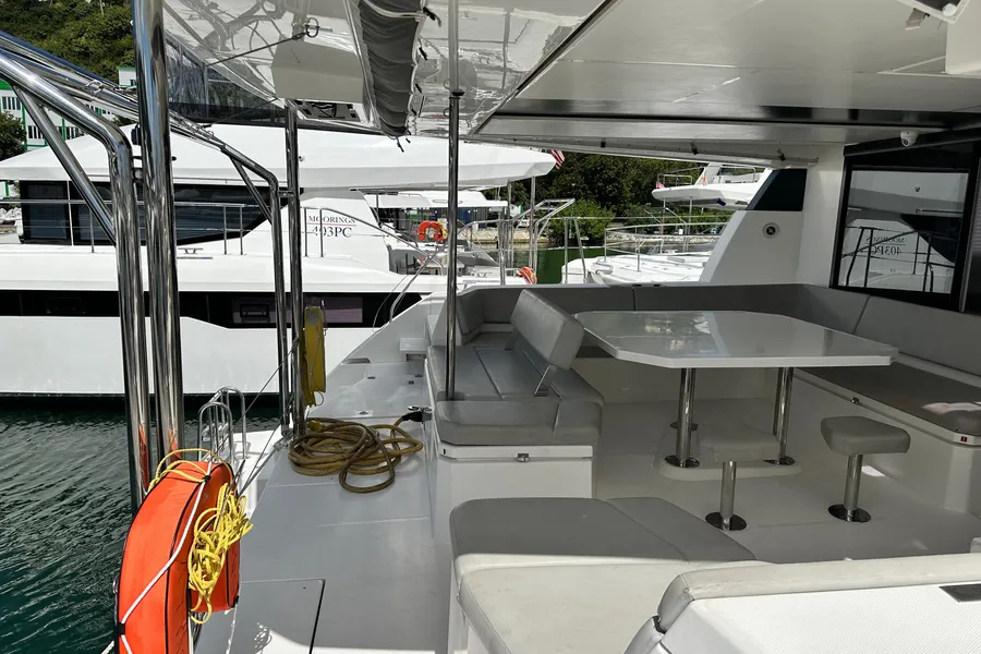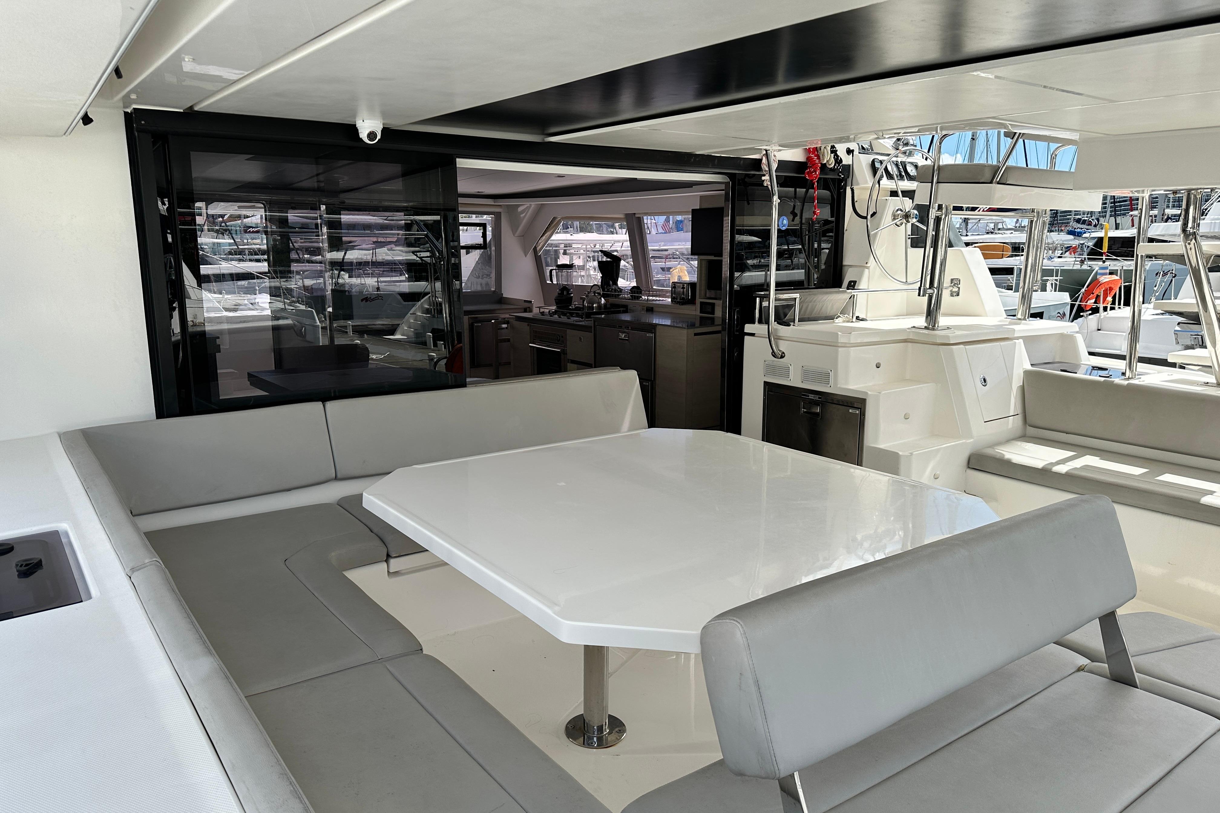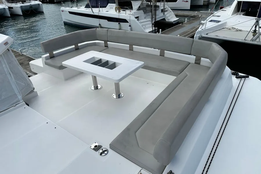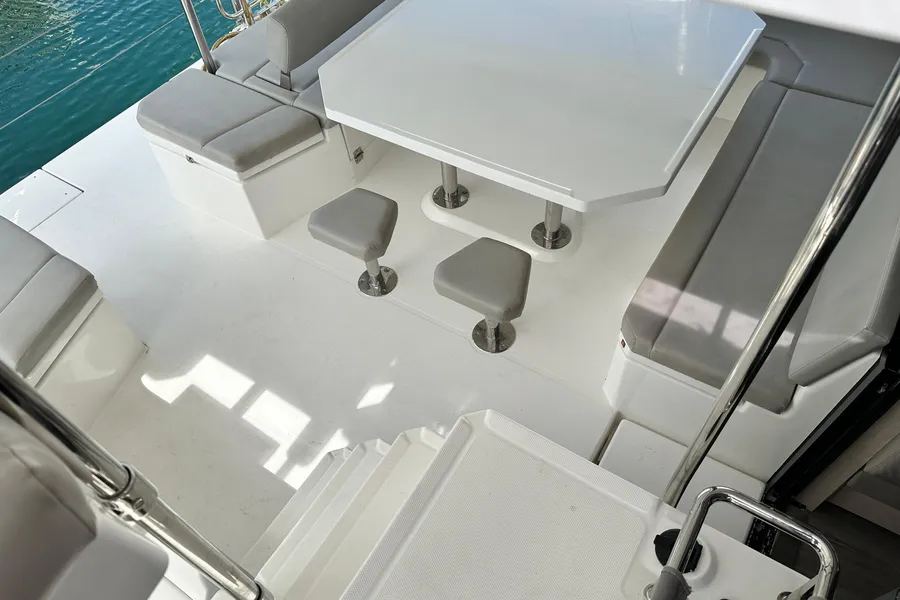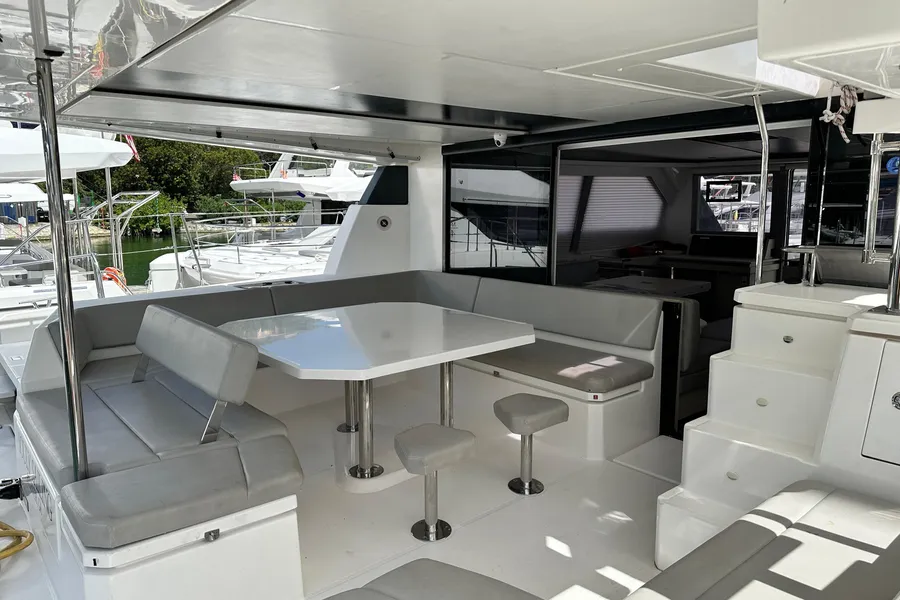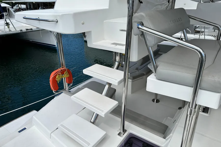 The Leopard 50 has the ideal layout for anyone looking for more outdoor living space as she comes equipped with a flybridge that includes a lounge area, table, sunbed and optional exterior speakers and shade awning. Access is provided by floating stairs leading up from the aft cockpit. An important distinction compared to similar sailboat flybridge configurations is that while under sail, passengers can move about the flybridge with ample headroom and never worry about interference from the boom. The flybridge is also situated to still maintain contact with the helm station, an important feature found on all Leopard Catamarans.