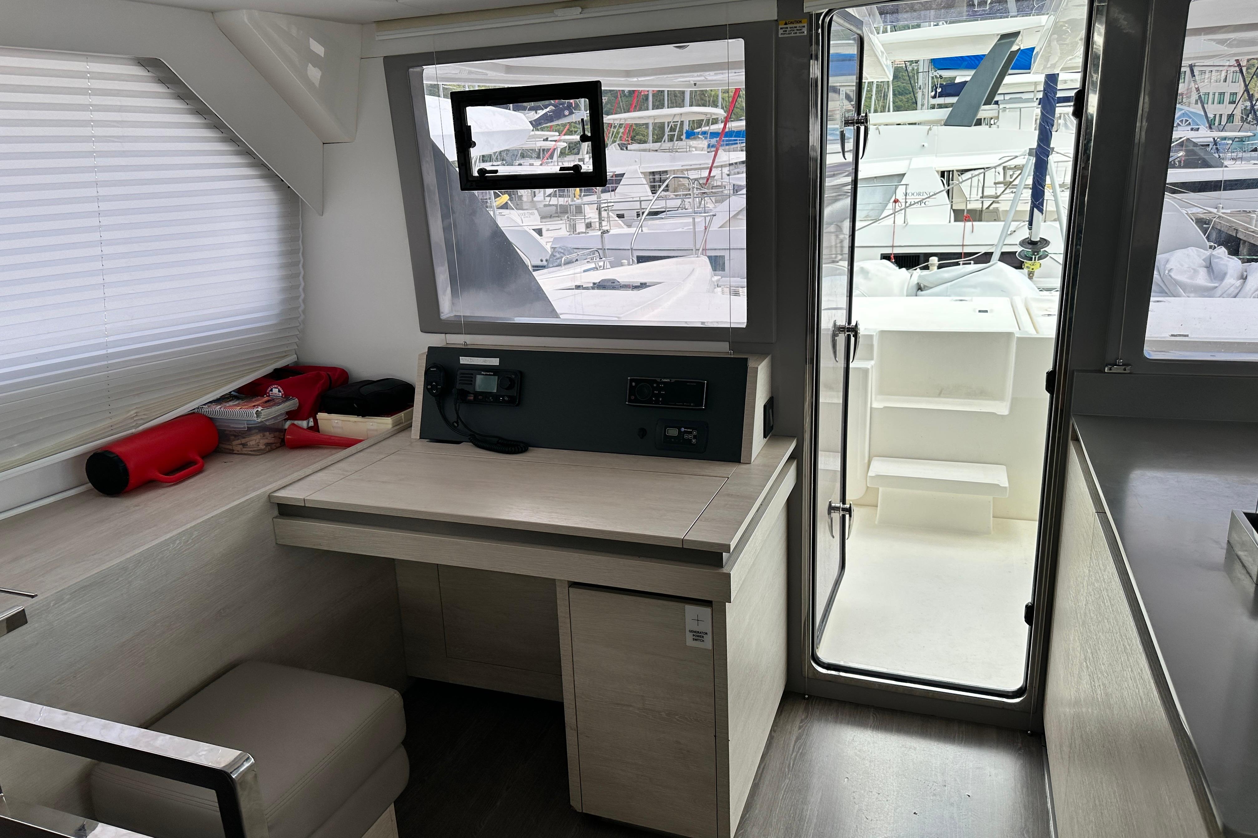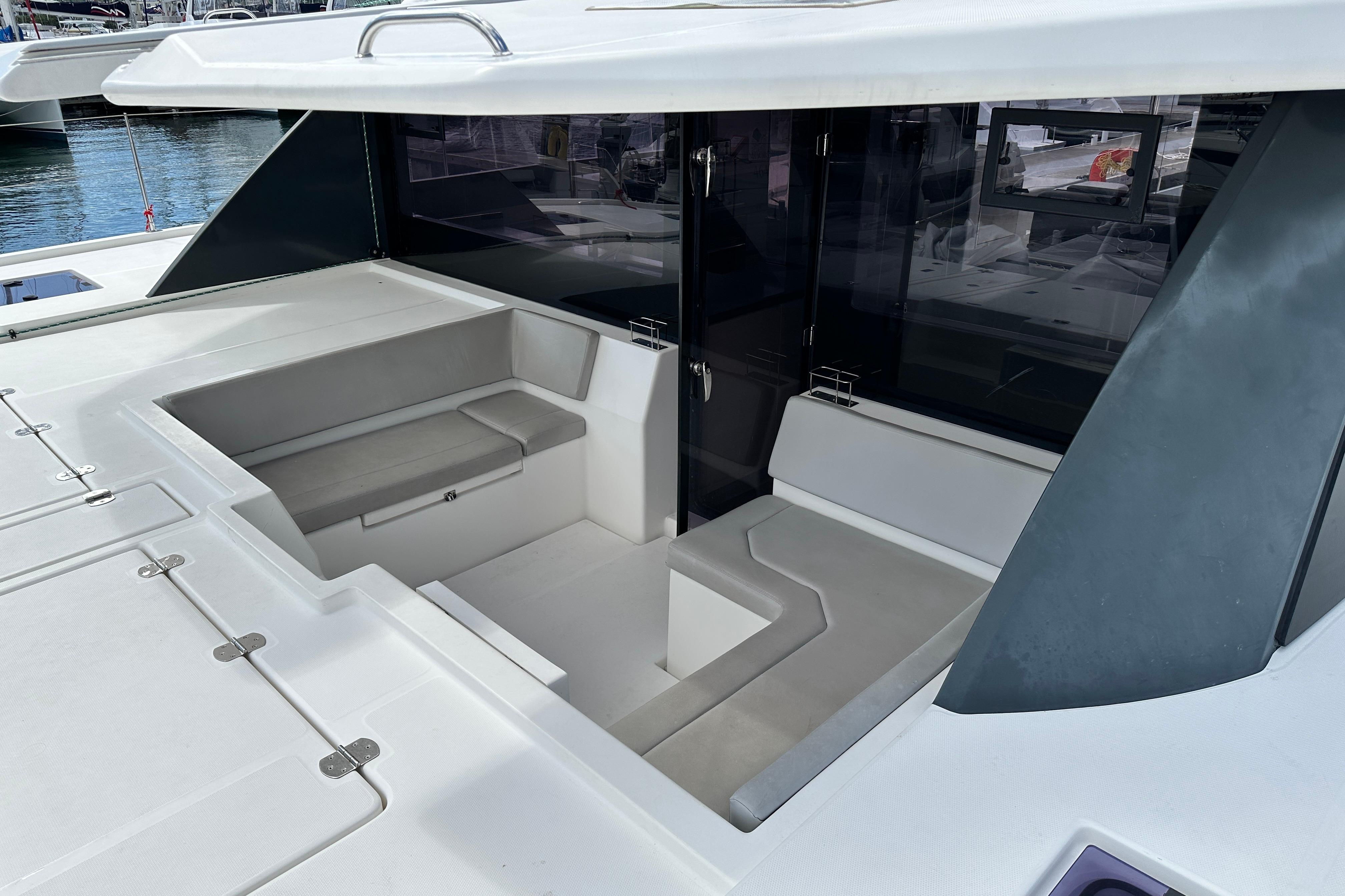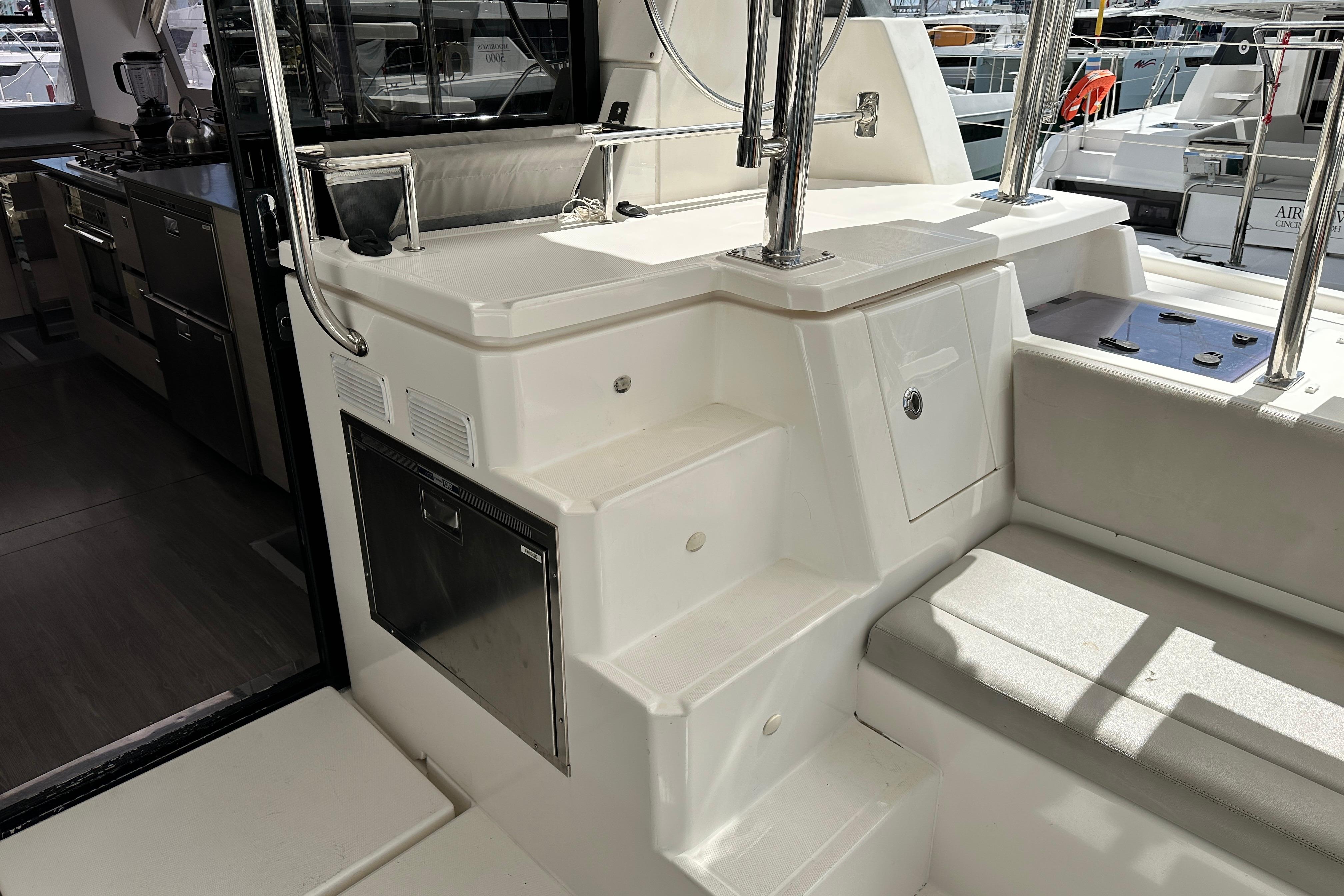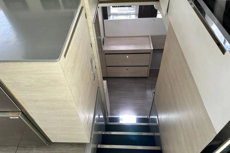The Leopard 50 has the ideal layout for anyone looking for more outdoor living space as she comes equipped with a flybridge that includes a lounge area, table, sunbed and optional exterior speakers and shade awning. Access is provided by floating stairs leading up from the aft cockpit. An important distinction compared to similar sailboat flybridge configurations is that while under sail, passengers can move about the flybridge with ample headroom and never worry about interference from the boom. The flybridge is also situated to still maintain contact with the helm station, an important feature found on all Leopard Catamarans.