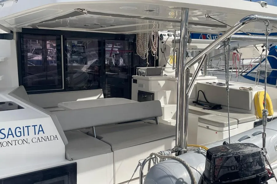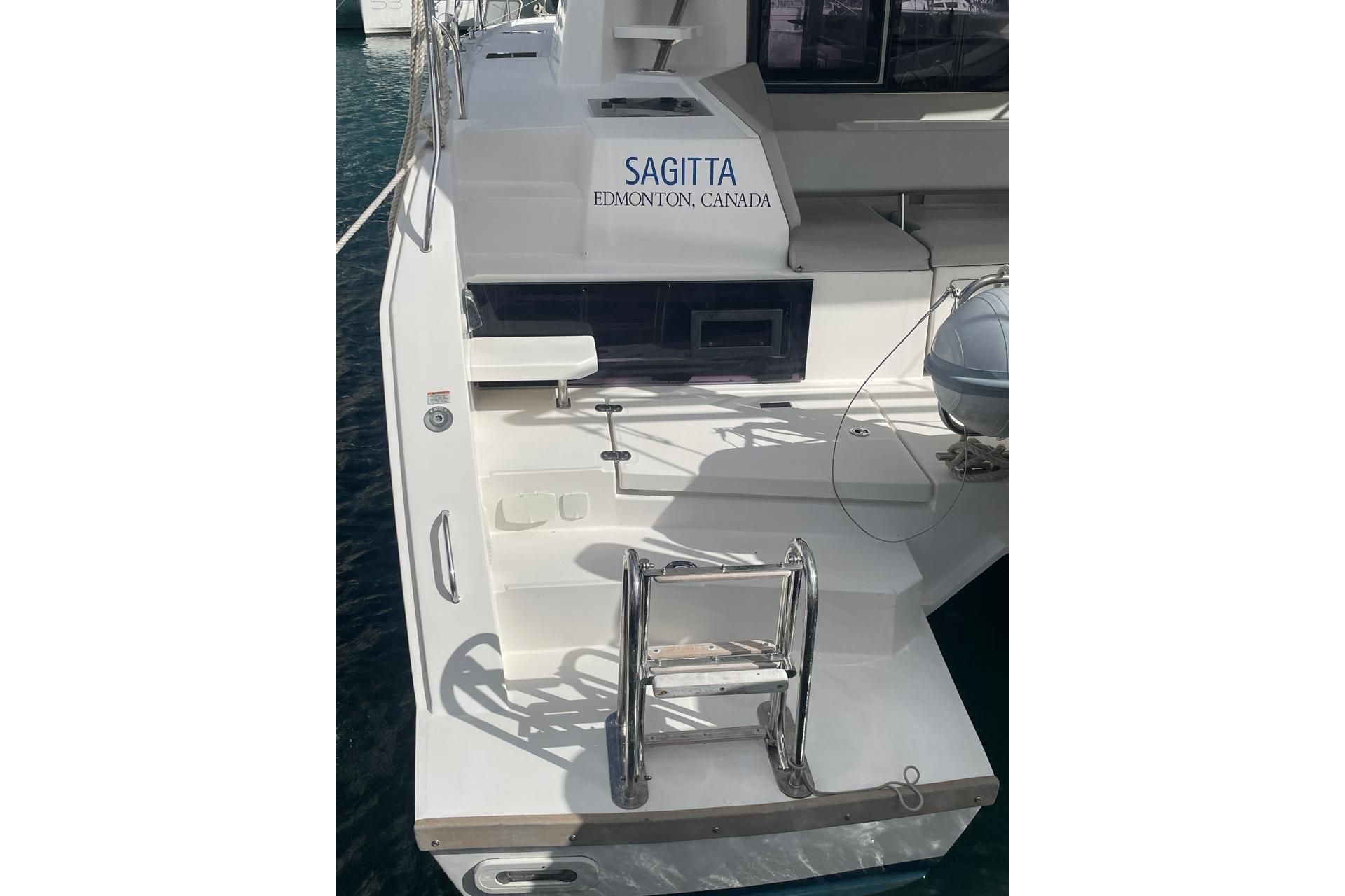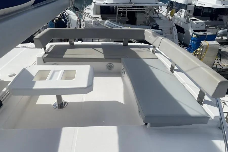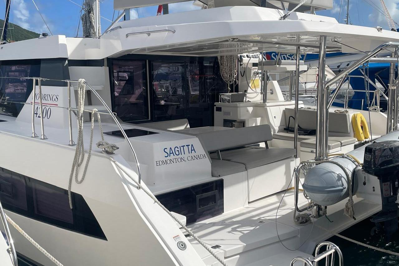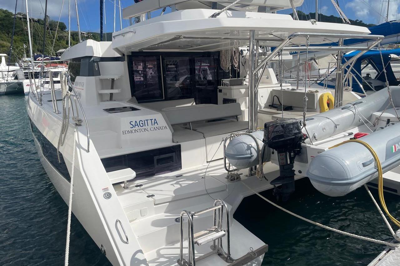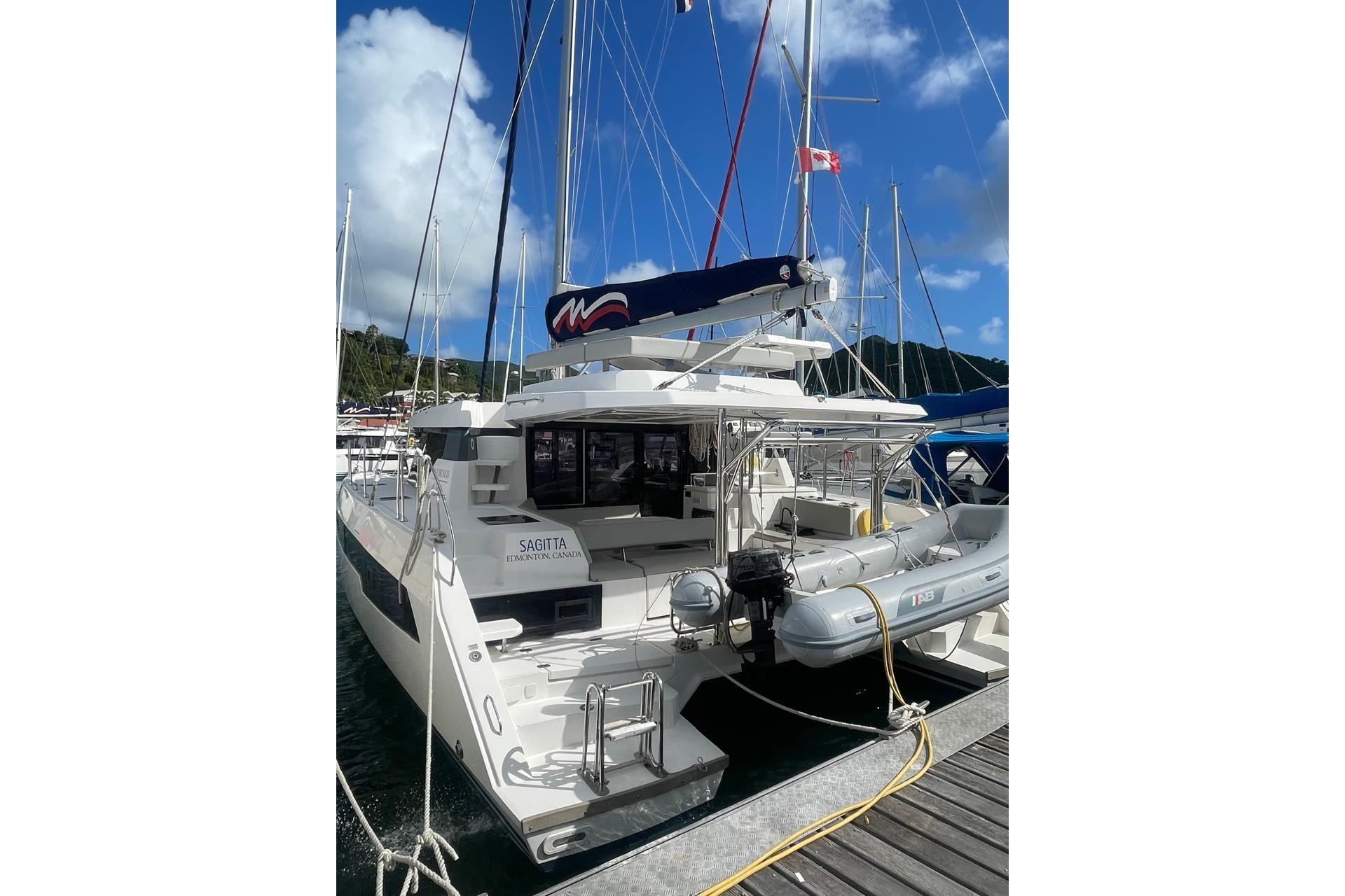 BROKERS REMARKS: SAGITTA is the first of the 42’s to come available leaving the fleet with limited numbers available in 2026. She is a 3 cabin 3 head owner layout with starboard side hull setup as the owners cabin. Has the latest interior scheme along with air conditioning, generator, watermaker, inverter, Yanmar engines, electric davits, walk through forward door and the upper lounge on the hardtop. Low hours than might usually see if some down time in Covid period. Located in St Martin a great place to start out in the Caribbean.