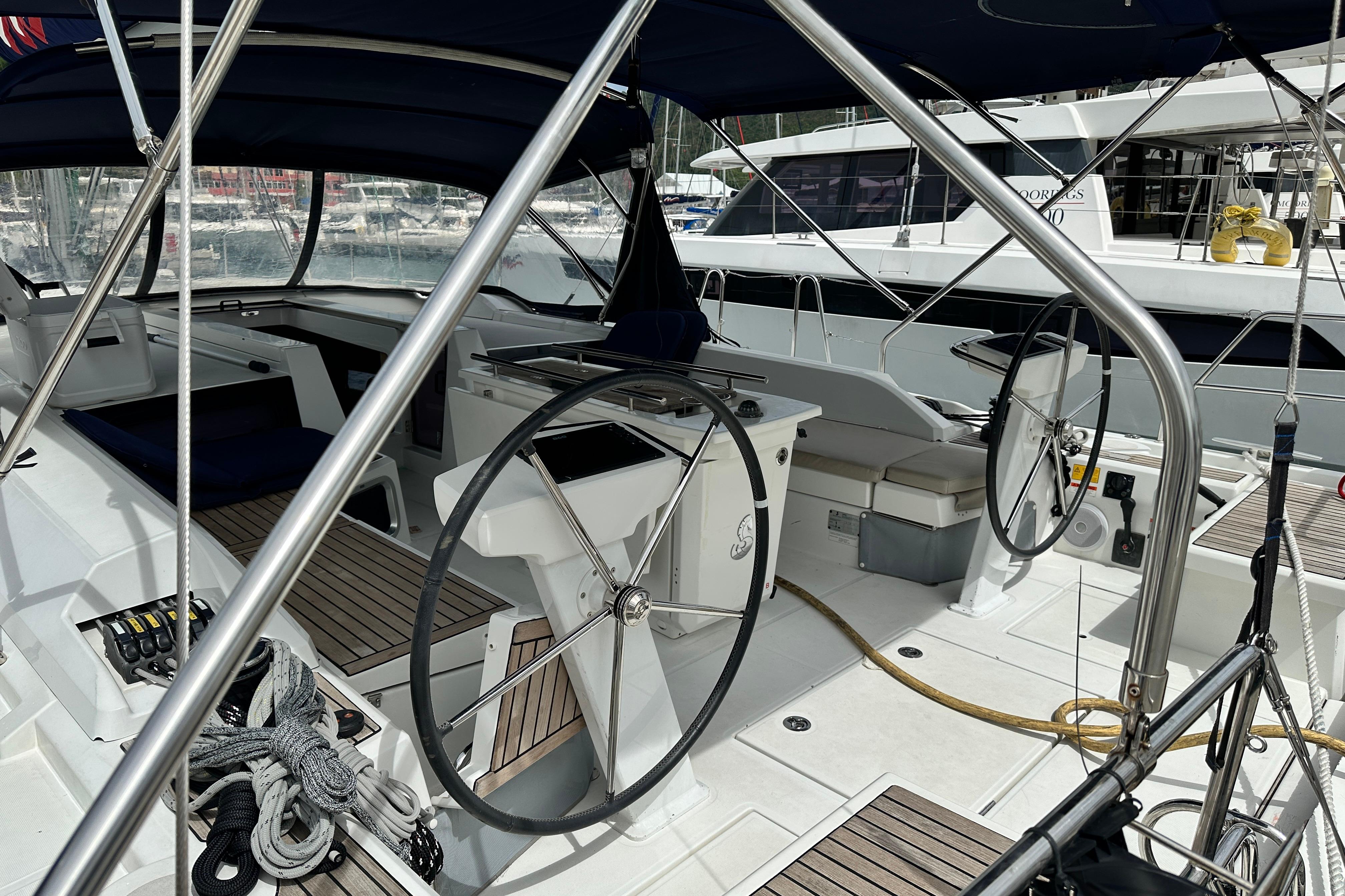 BUILDERS REMARKS: The Moorings 52.3. Designed by the renowned French boat manufacturers at Beneteau, this elegant cruiser sets the pace for livability on board and high-end performance.